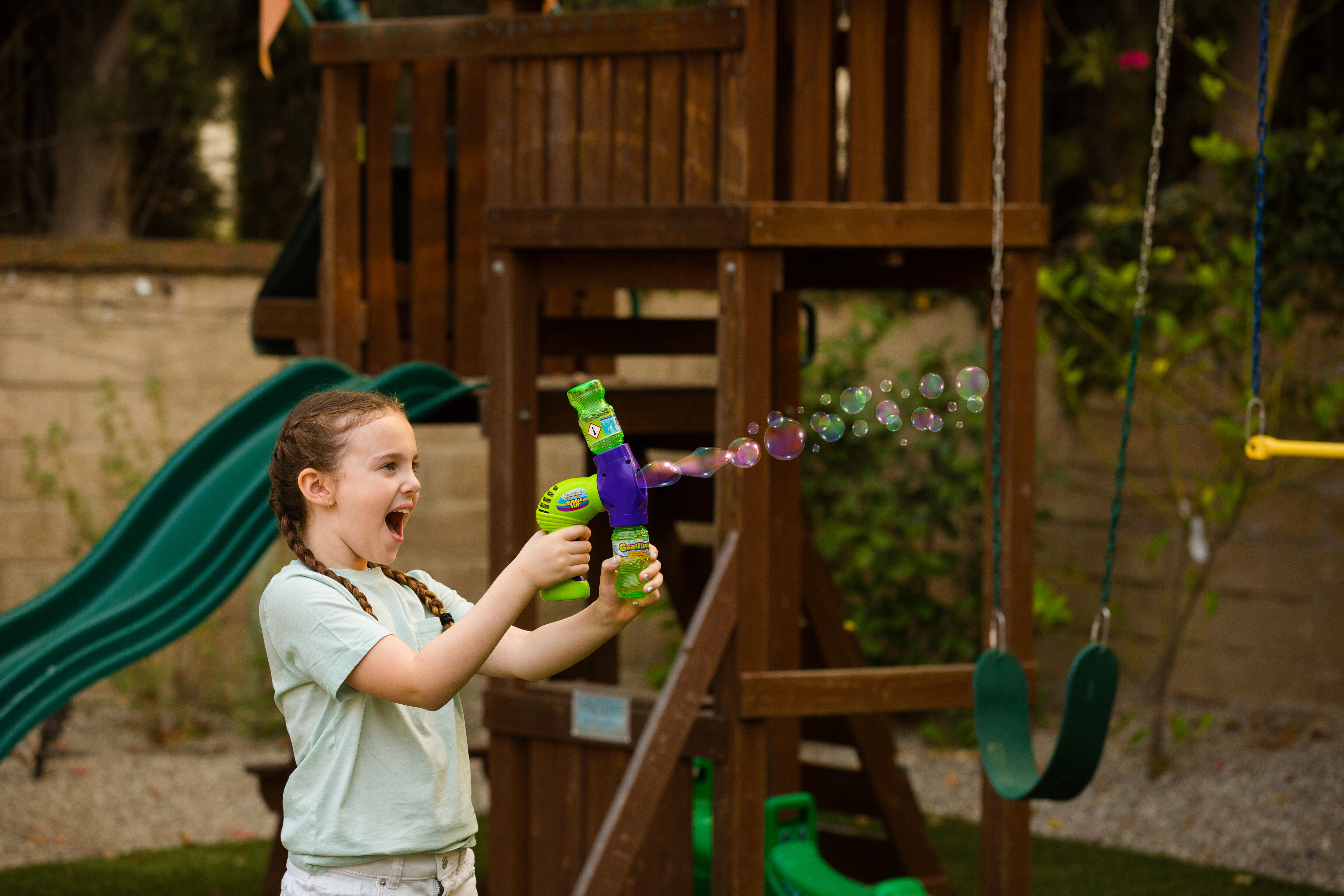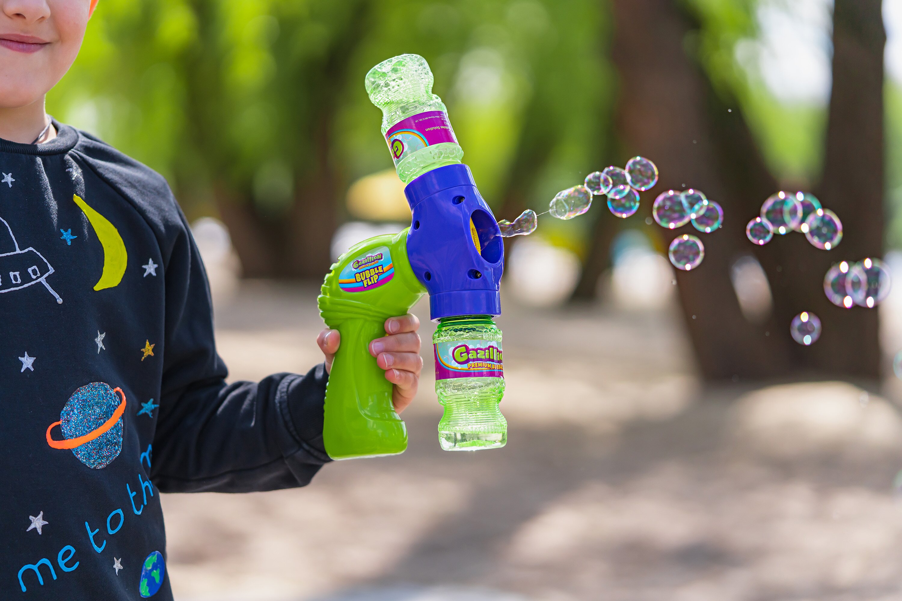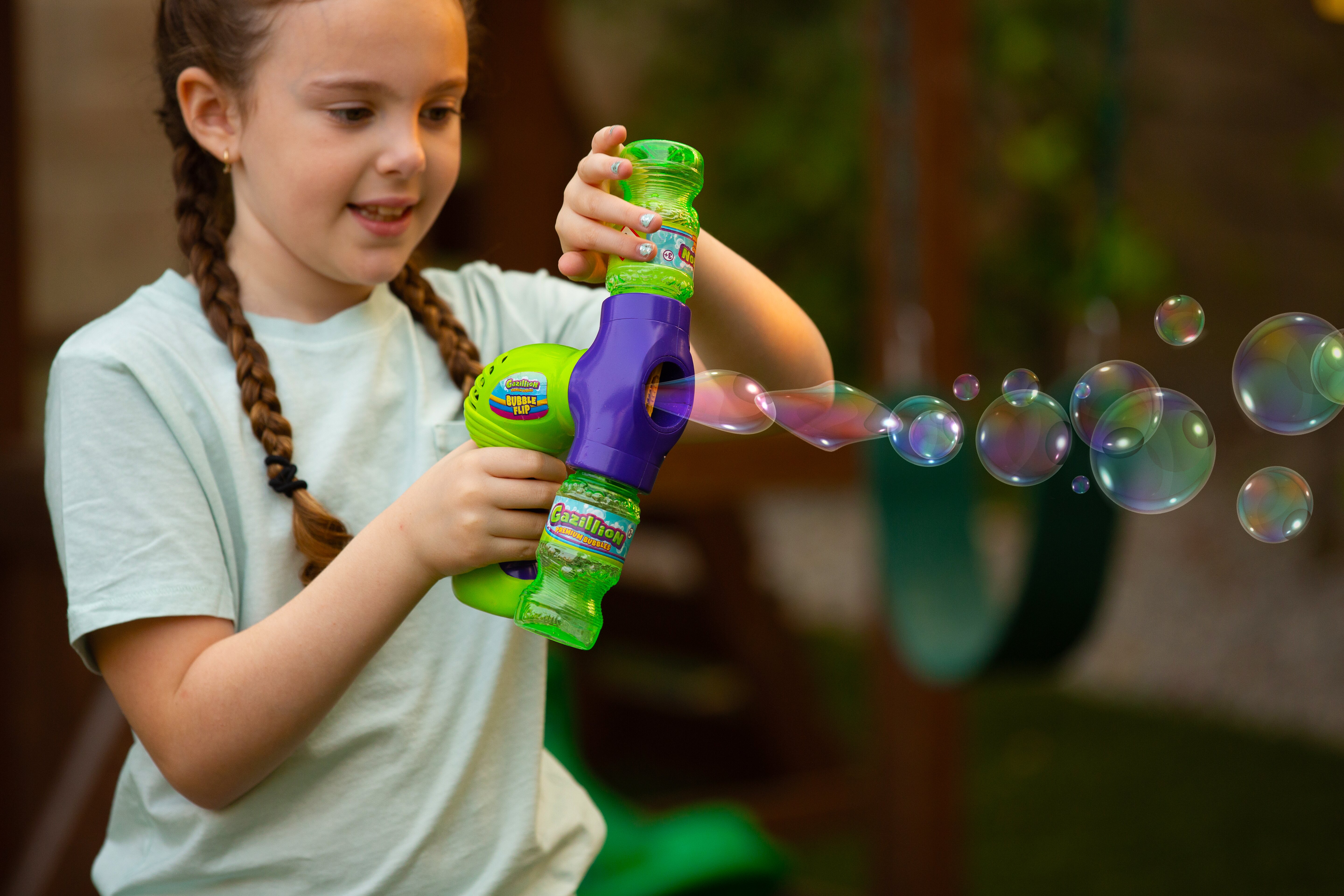 Представляем Gazillion Bubbles® Bubble Flip для непрерывного потока пузырьков! Благодаря дизайну флип-экшн веселье пузырей никогда не заканчивается! Вставьте бутылку с раствором в пузырчатый бластер, после полного нажатия на спусковой крючок начнется выдувание потока пузырьков. Когда бутылка опустеет, переверните переднюю часть бластера, используйте бутылку как ручку и снова нажмите на спусковой крючок, чтобы усилить действие пузырей!