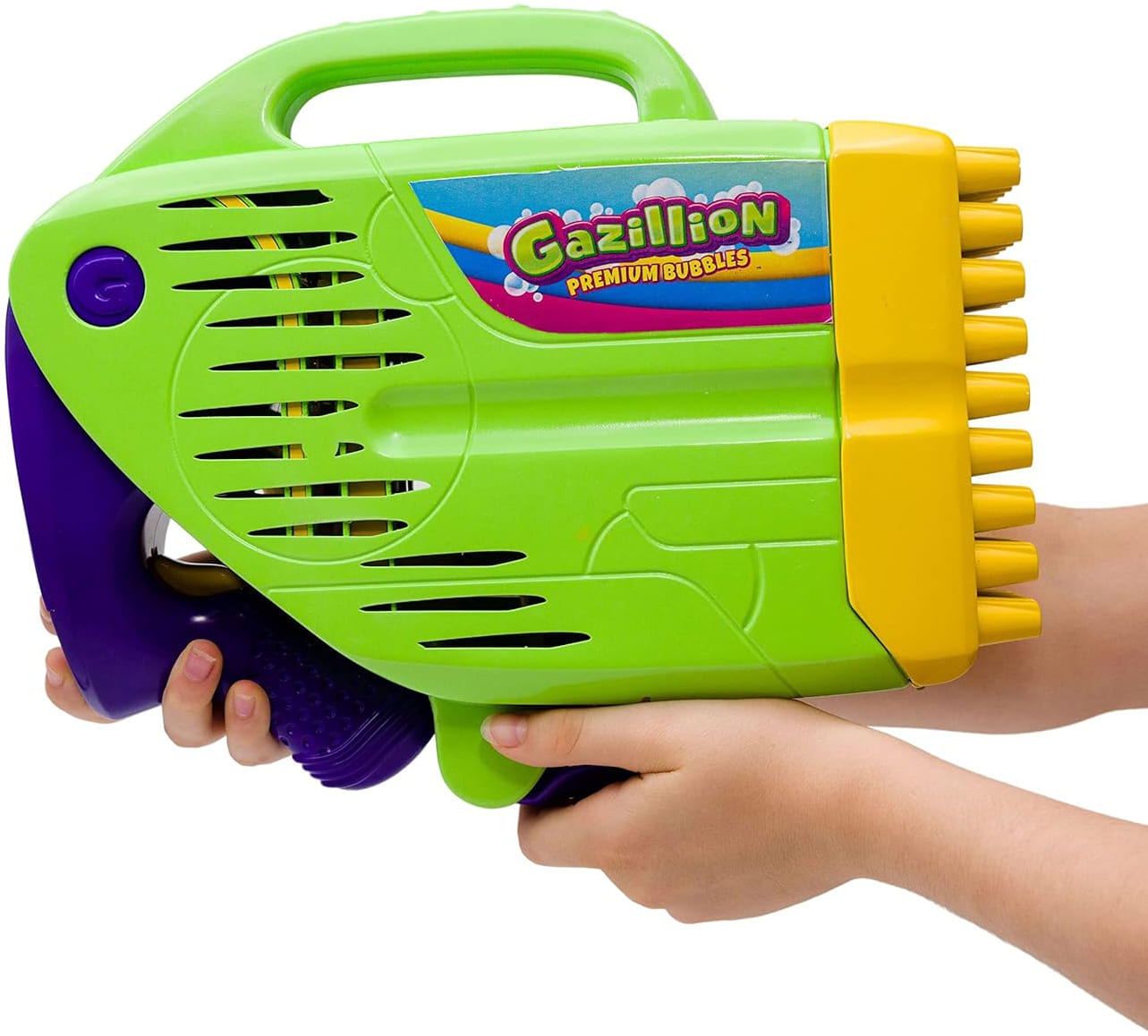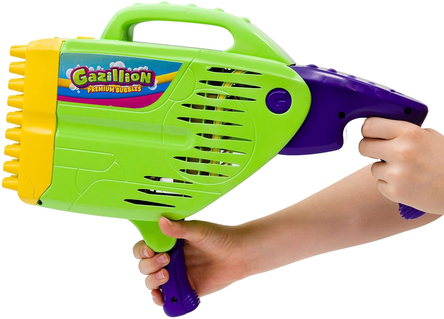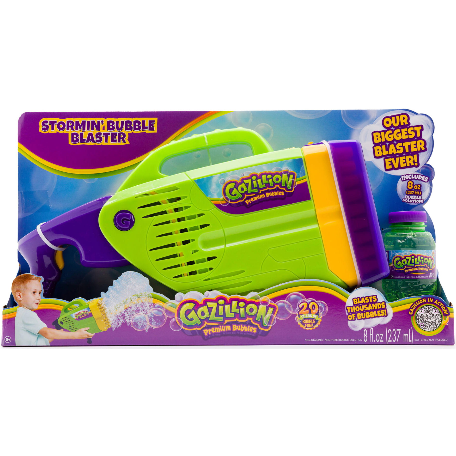 Приготовьтесь к буре… мыльных пузырей! Генератор мыльных пузырей Gazillion Stormin’ Bubble Blaster – это наш самый большой бластер, который выпускает множество больших пузырей! Просто окуните бластер в лоток, наполненный "супер раствором" Gazillion Bubbles, нажмите на курок и наблюдайте за ливнем пузырьков! Идеально подходит для сражений пузырями и веселья на открытом воздухе, Stormin’ Bubble Blaster предлагает 5 секунд непрерывных пузырьков перед повторным погружением в раствор. С Gazillion Bubbles вас ждет множество веселья с пузырьками!