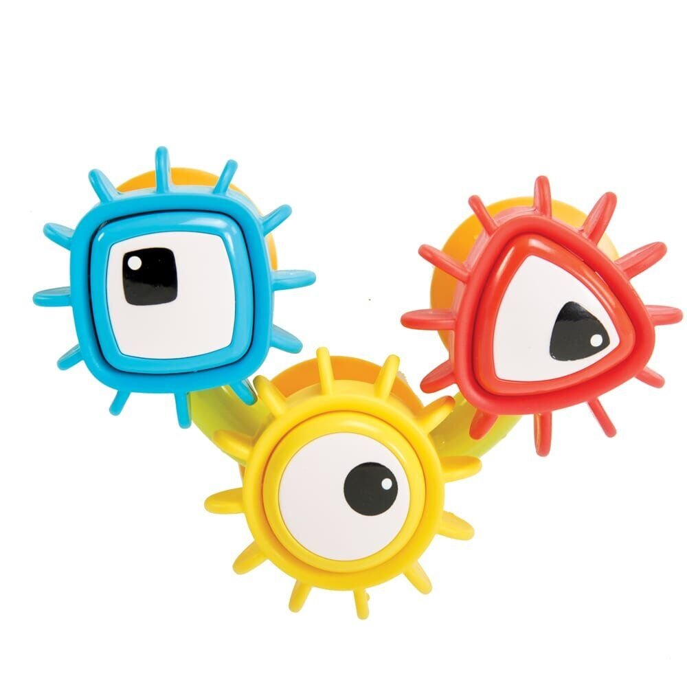 Перед началом игры необходимо закрепить игрушку на стенке ванной с помощью двух присосок. Нижняя часть с помпой должна быть полностью погружена в воду. Нажмите на маску с глазками, и через краник начнет течь водичка. Ребенок может складывать формочки в держатель по отдельности или сразу три в виде пирамидки и наблюдать за эффектом. Одна формочка имеет ситечко, вторая – пропеллером, а третья с поплавком. Кран и подставку под емкости свободно поворачивается в любую сторону.