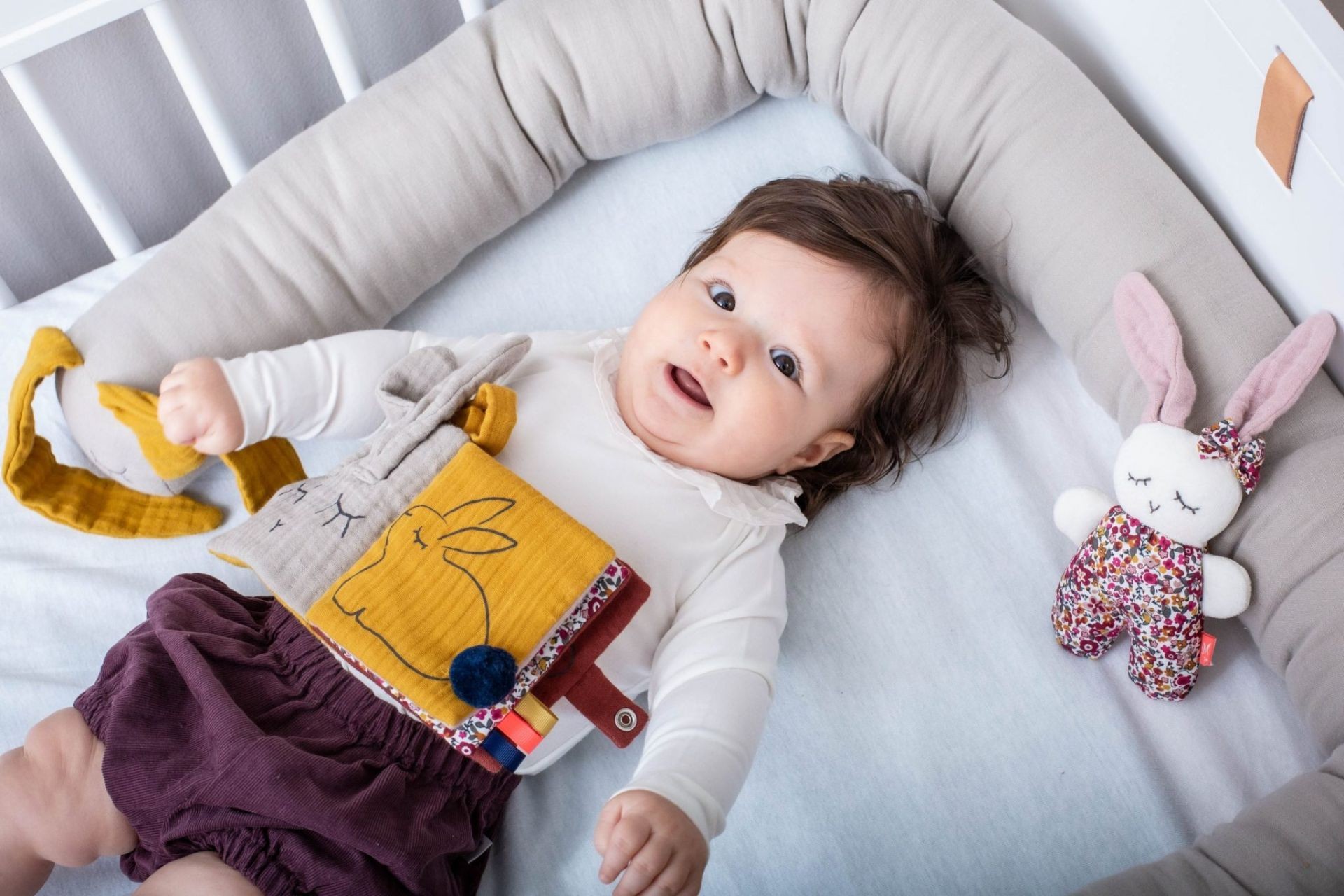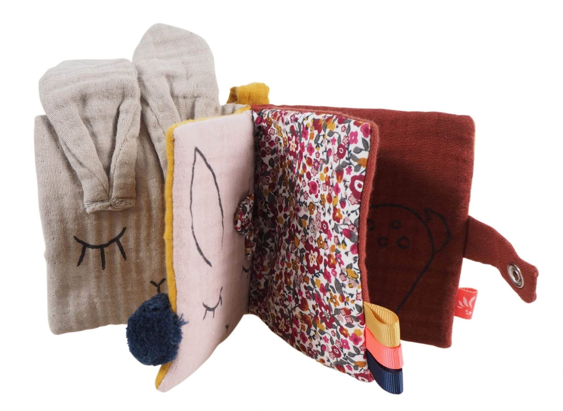 Сенсорное развитие: Книга содержит разнообразные фактуры тканей, шуршащие элементы и объемные детали, такие как мягкие ушки зайчика, стимулирующие тактильные ощущения.