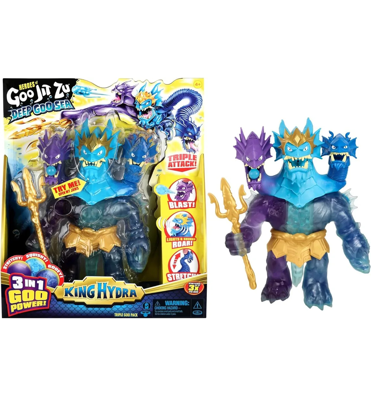Как и другие герои Goo Jit Zu дети могут растянуть фигурку Король Гидра в три раза, а затем наблюдать, как она возвращается к своей первоначальной форме!