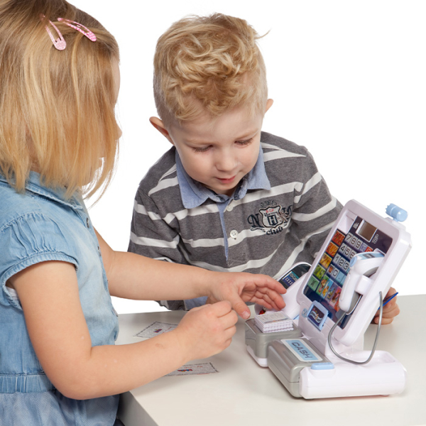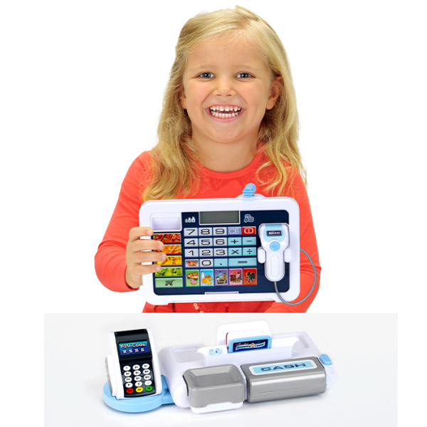 Этот современный кассовый аппарат предлагает массу возможностей для игры: дети могут сканировать игрушечные товары, вводить цены на электронном дисплее, а затем с помощью функции калькулятора точно подсчитать общую сумму покупок. Не хватает продуктов на полках? Легко! Просто снимите планшет, просканируйте пустые места и «закажите» новые товары -все как в настоящем магазине.