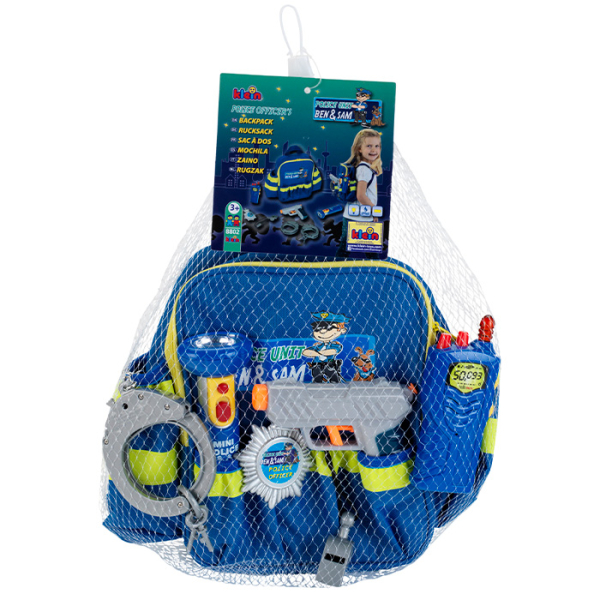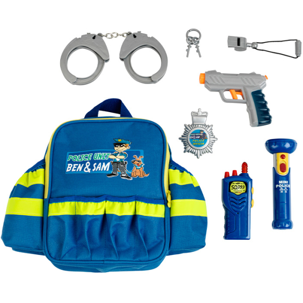 Имеет регулируемые лямки длиной до 44.5 см, боковые карманы и четыре передних с эластичными краями. Большой отсек на молнии позволяет удобно наполнять и доставать вещи. В комплект входят игрушечные наручники с ключом, фонарик, значок, свисток, игрушечный пистолет и рация.