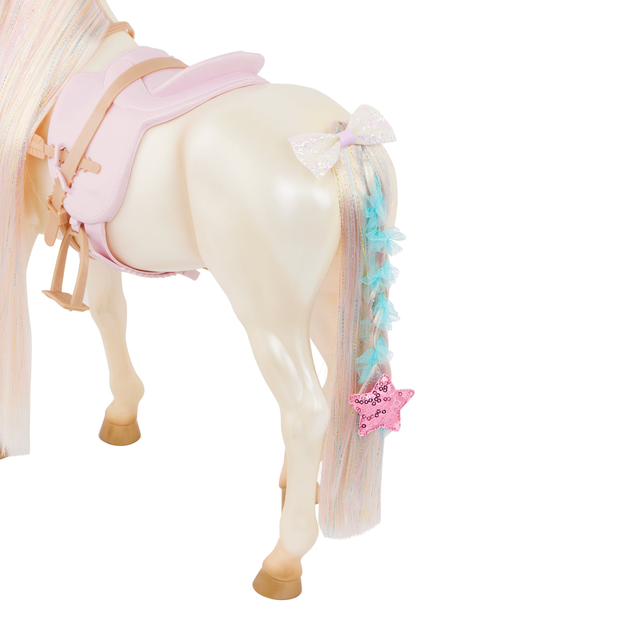 Погрузитесь в магический мир приключений вместе с Волшебным конем от Our Generation! Эта роскошная лошадь высотой 50 см идеально подходит для кукол Our Generation ростом 46 см, которую можно удобно посадить в яркое розовое седло. Его очень длинная грива и хвост украшены радужными блестками, которые придают магии каждой прогулке.