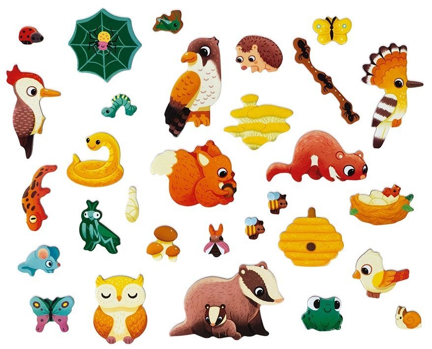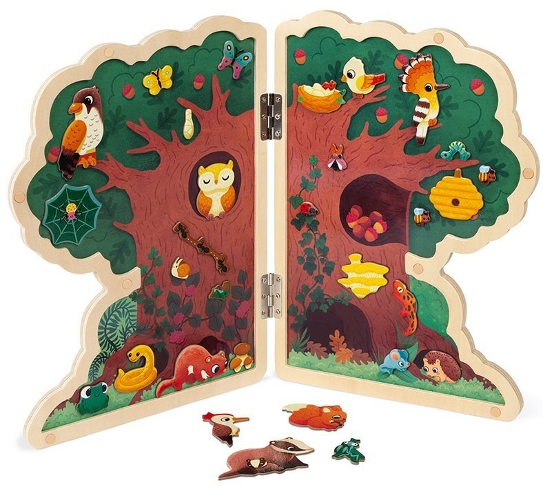 Придумывай невероятные истории c магнитным деревом Janod! Магнитное дерево имеет 30 магнитов, чтобы украсить его и дать волю своему воображению. Включает в себя различных животных и растений. Идеальный способ в игровой форме узнать названия лесных животных. После игры дерево можно закрыть.