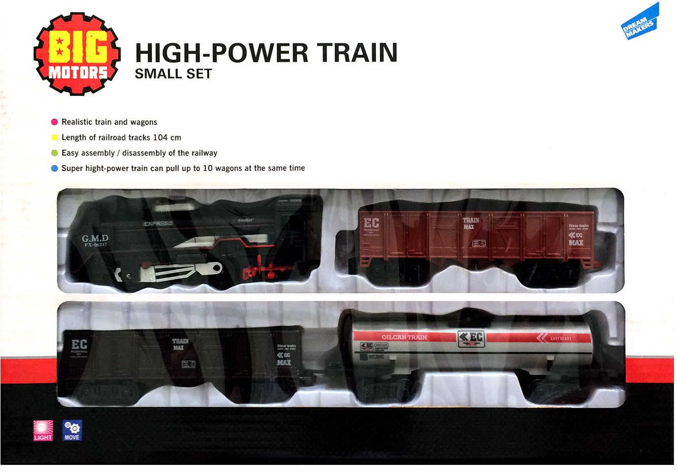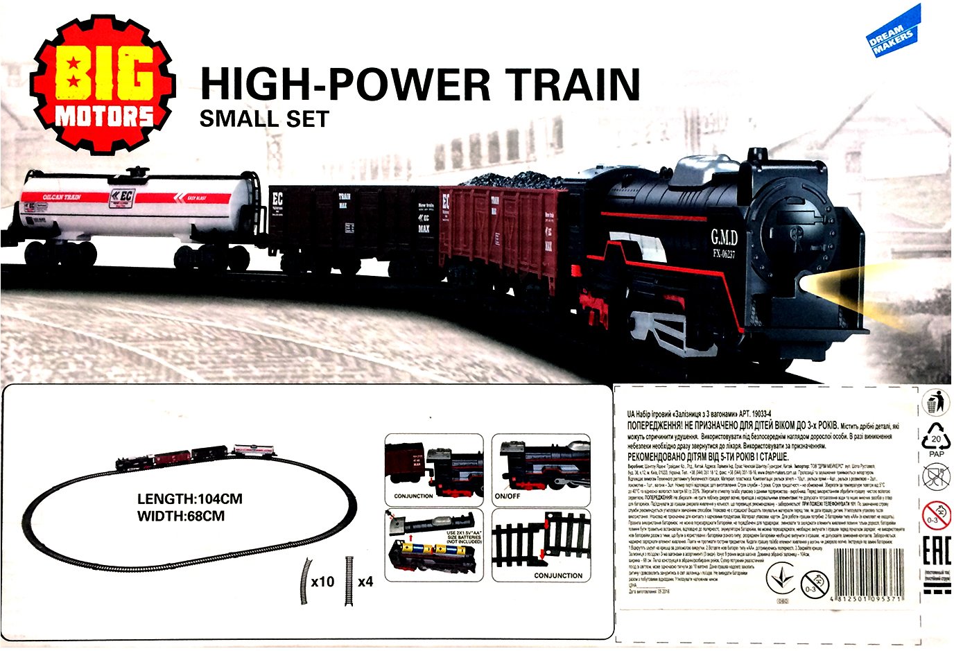 Игровой набор Big Motors Железная дорога с 3 товарными вагонами (19033-4) понравится детям с 3 лет. Длинна собранной железной дороги 104 см, ширина 68 см. Локомотив может тянуть до 10 вагонов.