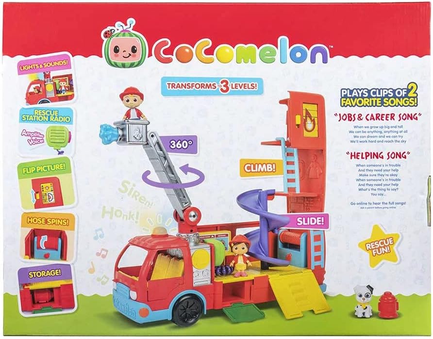 Быстрее мчитесь на помощь с пожарной машиной-трансформериом CoComelon! Эта 3-уровневая пожарная машина с подсветкой, звуковым сопровождением и поворотной выдвижной лестницей поможет пожарным Джей Джею и Нине быстро добраться и решить любые чрезвычайные ситуации.