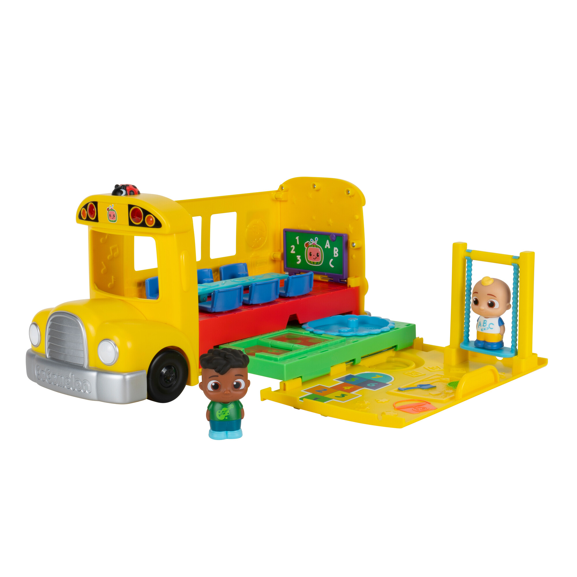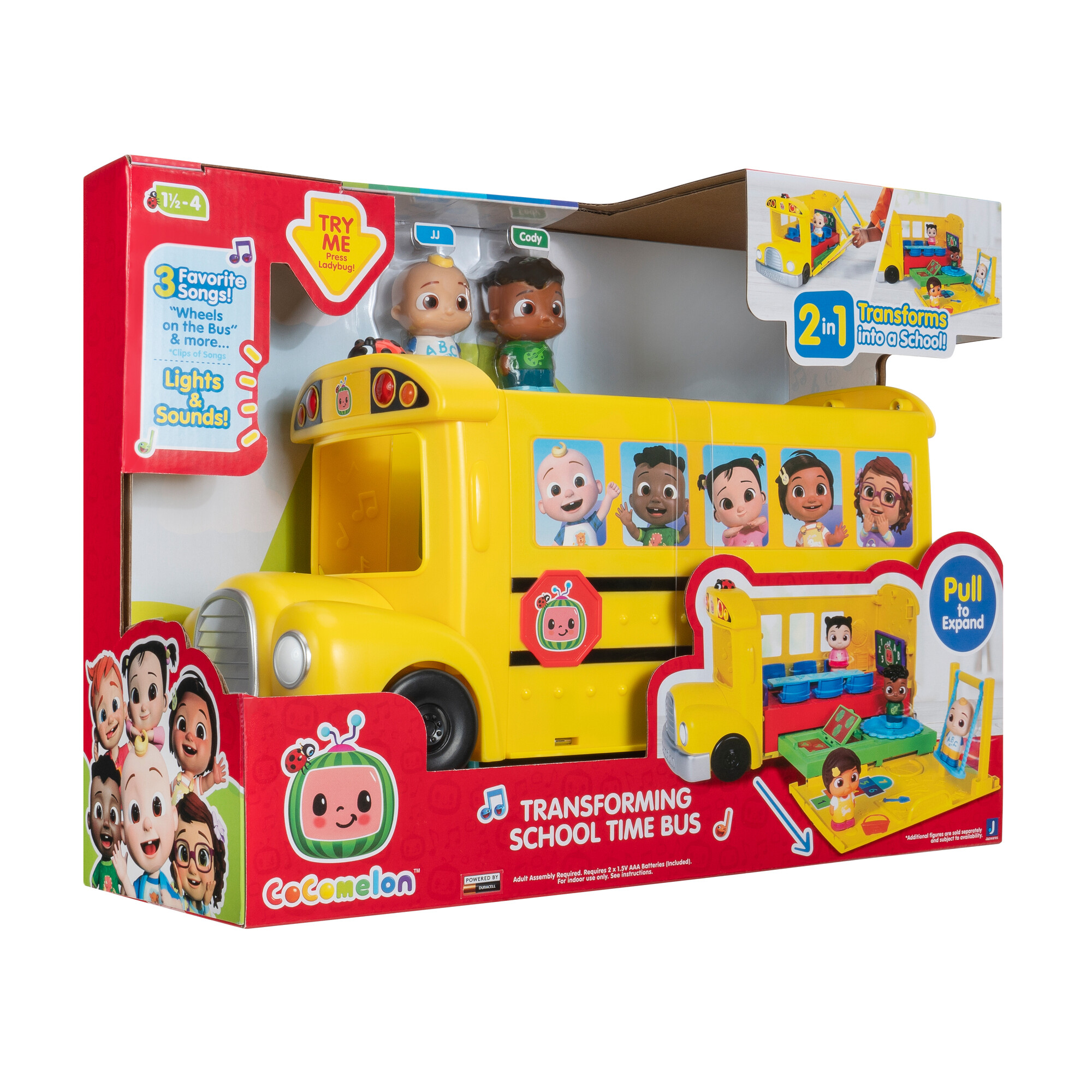Присоединяйтесь к Джей Джею и Коди во время веселого дня в школе с CoComelon Transforming School Time Bus! Этот автобус-трансформер 2-в-1 содержит 6 игровых зон, включая классную комнату и детскую площадку!