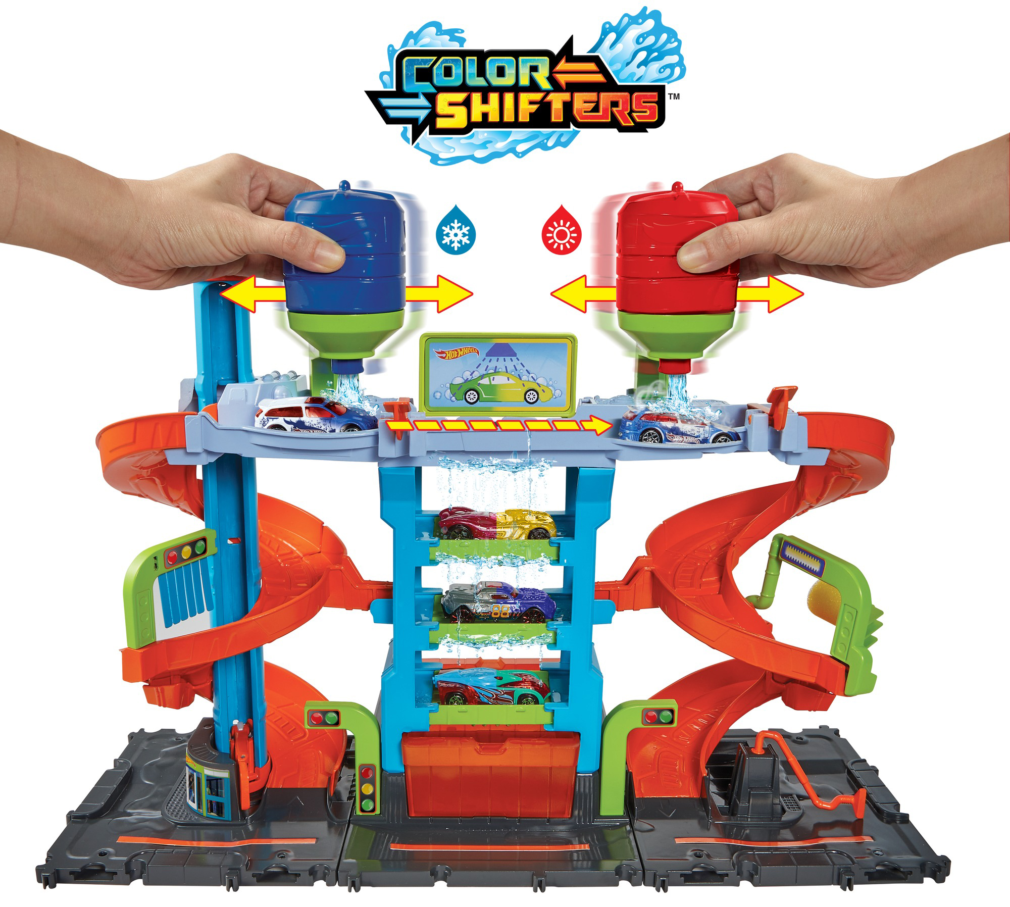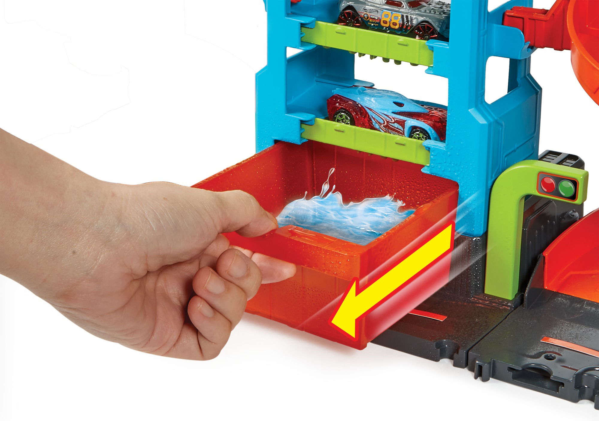 Заезжайте на "Автомойку: Мегабашню" Hot Wheels серии City, где можно не только помыть свой автомобиль, но и повеселиться! Подъезжайте к башне автомойки и покрутите ручку, чтобы поднять машинку спиралью. Наверху размещены два резервуара, которые распыляют горячую и холодную воду на машинку серии "Измени цвет", магически меняя ее окраску. Пока машинки мчатся по мойке, вода скапливается в размещенных снизу поддонах, чтобы не образовывать беспорядок во время игры.