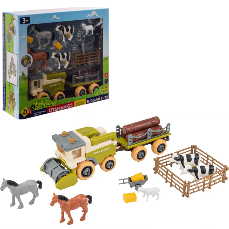 В комплекте: комбайн с прицепом, лошади, коровы и овца, отвертка для сборки/разборки.