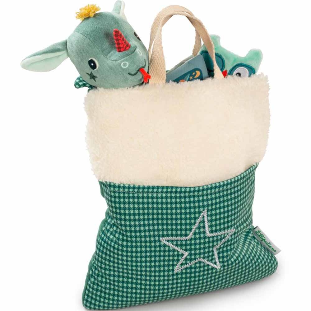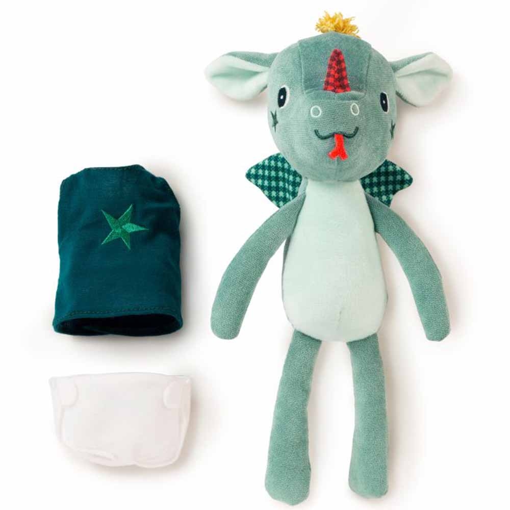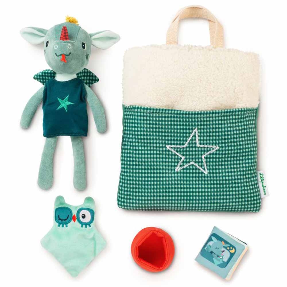В наборе, кроме дракончика, есть сумка с ручкой из мягкого материала. Эту сумку также можно использовать как уютную кровать. На передней части есть флуоресцентная звезда, которая светится в темноте.