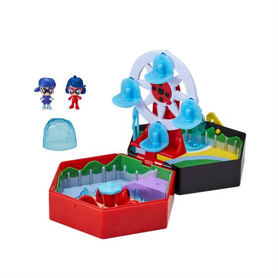 Подвижные аксессуары: колесо обозрения и карусель вращаются, замороженный купол открывается, фонтан, переворачивается, касса для продажи билетов поднимается и опускается.