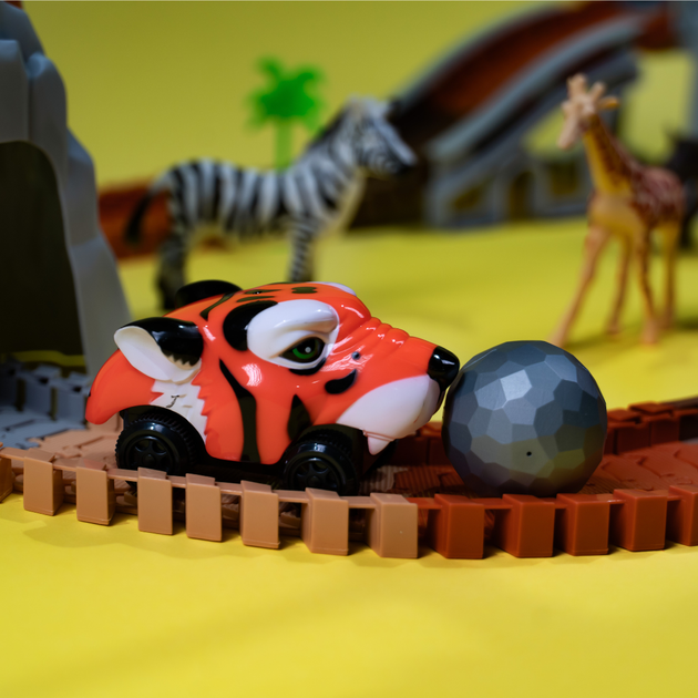 Гибкий трек легко изменяет форму, а препятствия и повороты прибавляют драйву.