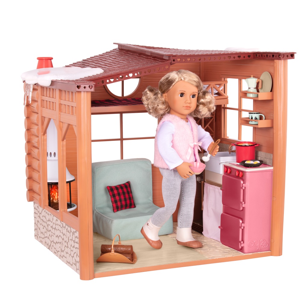 Проведите праздничные торжества в уютном домике «Наше поколение»! В этом открытом кукольном домике есть декоративный снег на крыше, открывающиеся ставни и реалистичные детали, чтобы ваши 18-дюймовые куклы могли наслаждаться бесконечным праздничным весельем! Пригласите своих лучших друзей на поджаренный горячий шоколад и вкусные блюда, пока вы «нагреваете» их на плите - конфорки загораются, когда вы поворачиваете диск! Храните кувшин для молока, масло и бутылку сока в мини-холодильнике, а кружку, тарелки и кухонные принадлежности всегда под рукой на полках для хранения над плитой. Время S’mores!