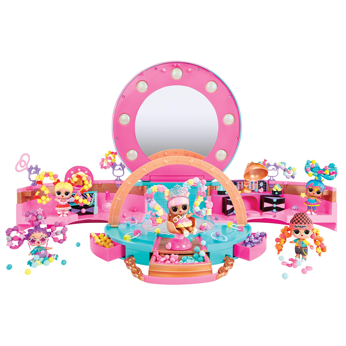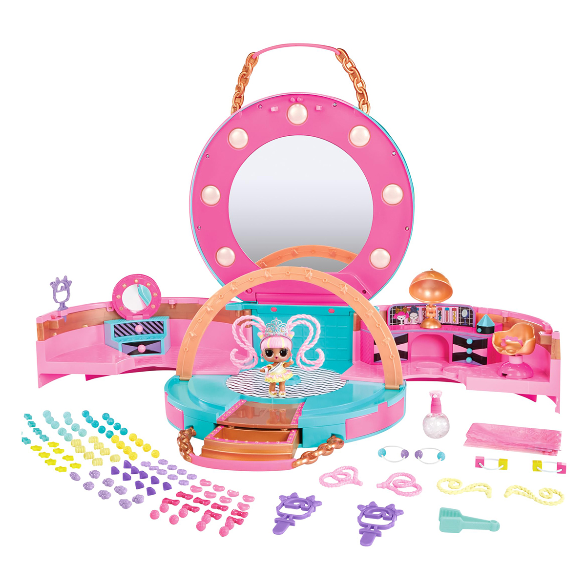 Куколка L.O.L. SURPRISE! собирается на лучшую вечеринку этого года. Только Вы сможете ее подготовить к этому празднику и сделать куколку самой яркой и стильной. Встречайте игровой набор с куклой L.O.L. SURPRISE - САЛОН ФЕЕРИЧЕСКИХ ПРИЧЕСОК С бусинками. Это раскладной набор в виде компактной сумочки голубовато-розового цвета, с ручкой-цепочкой. Погружайтесь в творчество с L.O.L. SURPRISE!