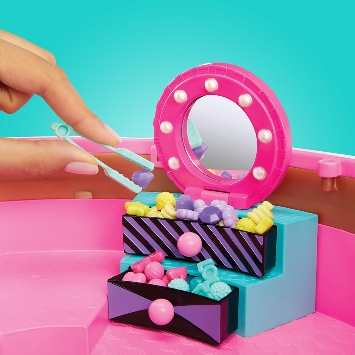 Для создания прически из волшебных бусинок: положите куколку на коврик, вставьте основы для прически в специальные отверстия и опустите их в воду. Разложите бусинки с помощью пинцета и сбрызните водой. Подождите 5-10 минут до полного высыхания, и ваша фантастическая прическа для куколки готова!