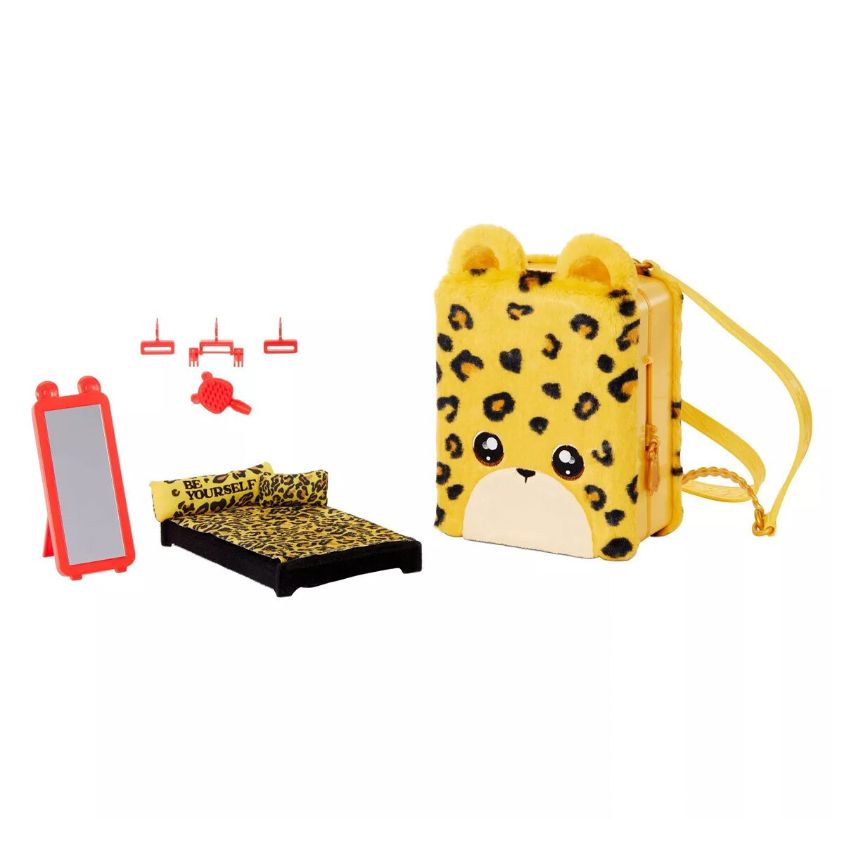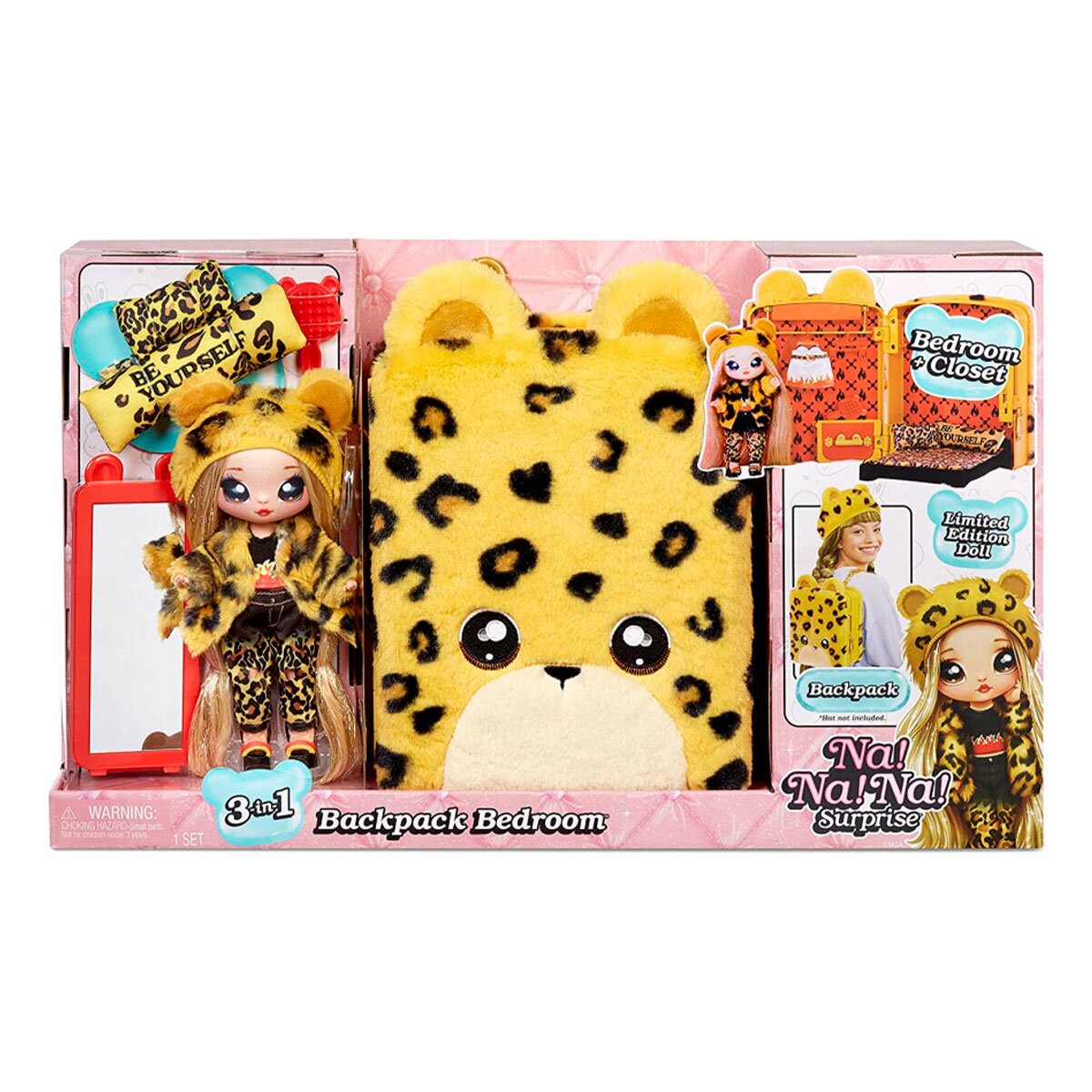 Игровой набор с куклой NA! NA! NA! SURPRISE 3 в 1 - РЮКЗАЧОК-СПАЛЬНЯ ДЖЕННЭЛ ЯГУАР - это милый плюшевый рюкзачок в виде ягуарчика, внутри которого спряталась уютная комнатка с эксклюзивной куколкой. Найдите все сюрпризы! Обустройте комнатку так, как Вам нравится, только посмотрите какое в ней все пушистое и мягкое! В шкафчик можно вешать всю одежду для куколки, а также есть ящик для хранения аксессуаров. Возле милого зеркала в полный рост куколки она будет любоваться всеми нарядами. А на кроватке она может отдыхать на мягких подушках и под теплым одеялом.