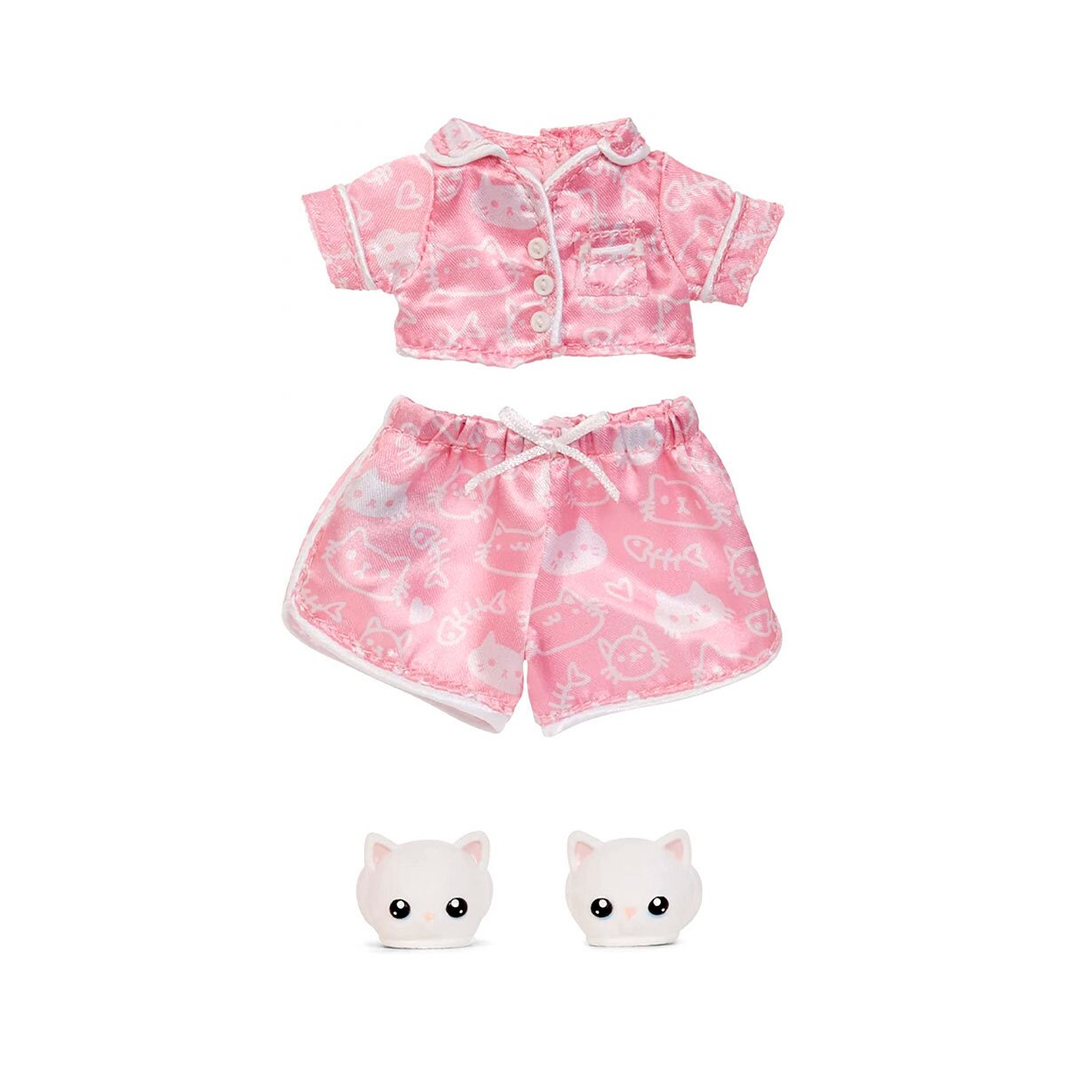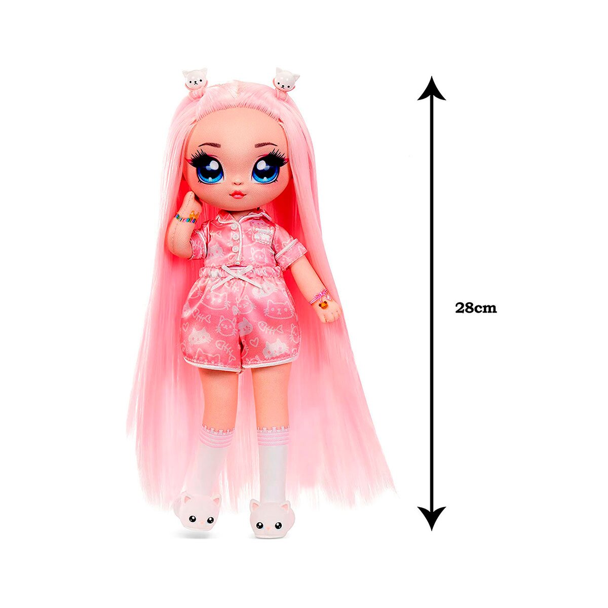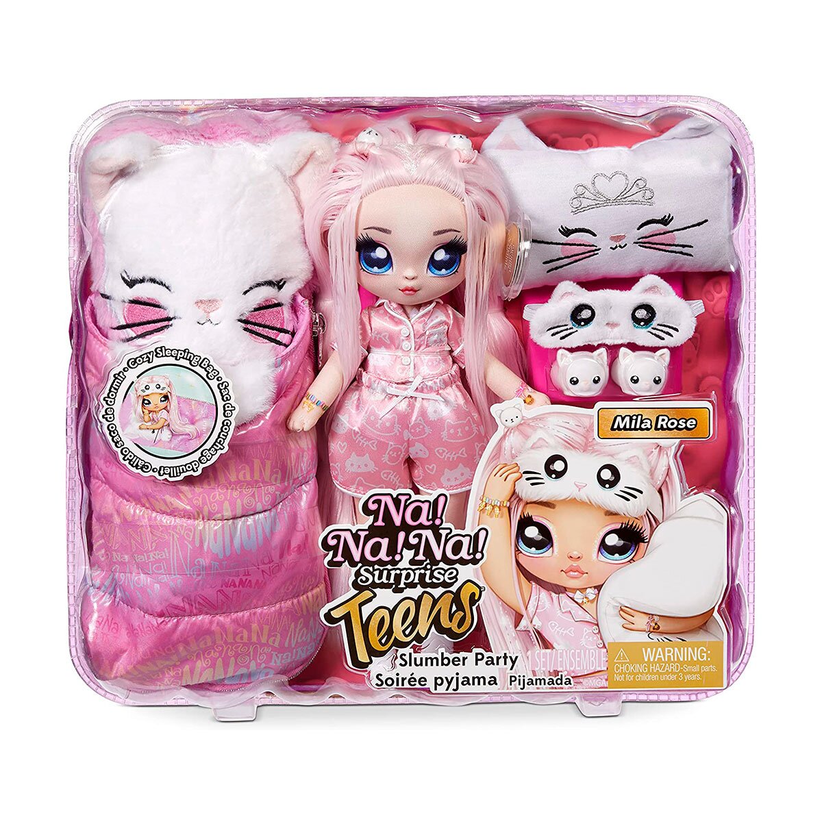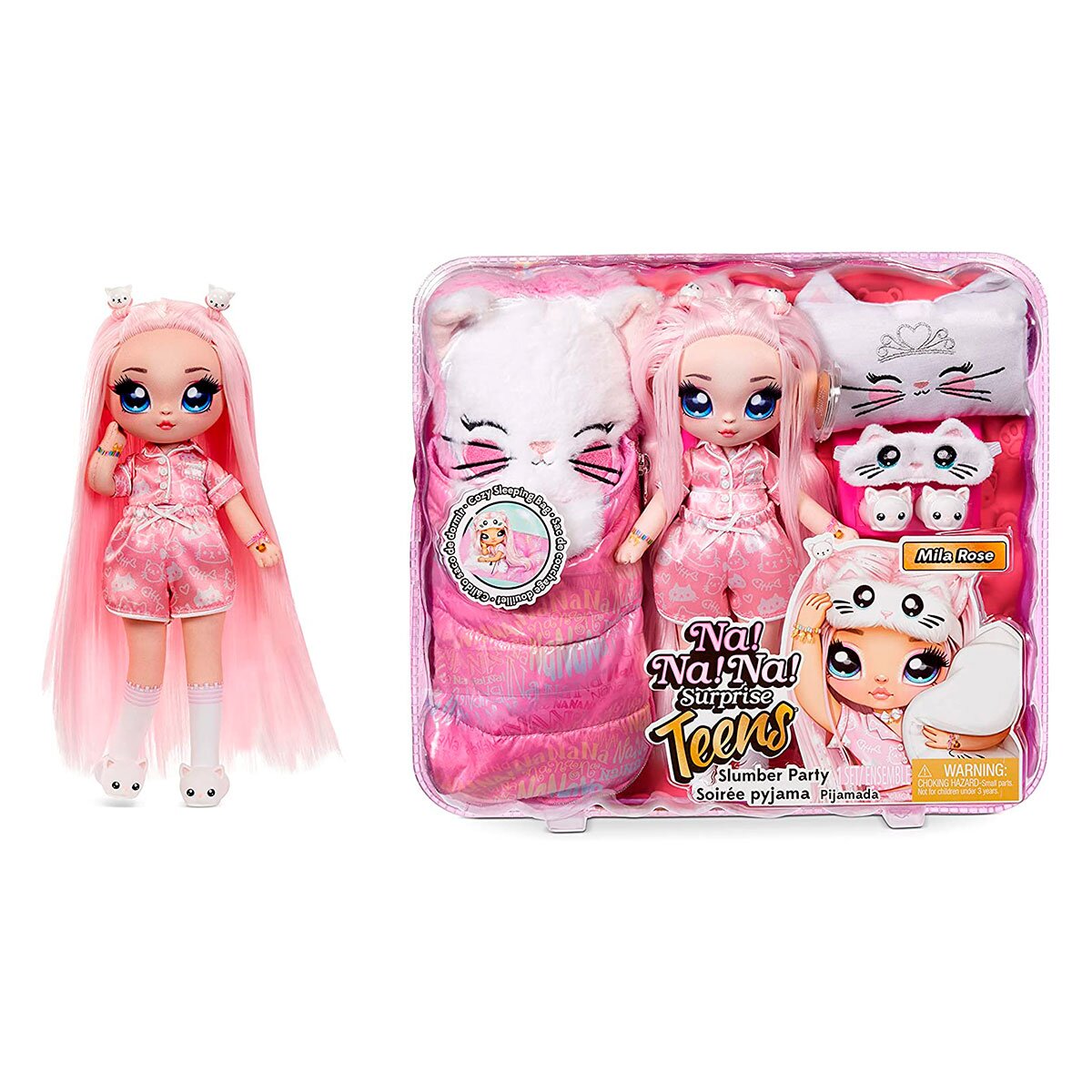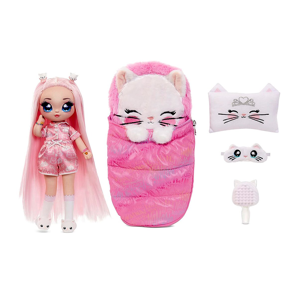 В наборе стильная куколка Na! Na! Na! Surprise! "Teens", высотой 28 cm, с длинными розовыми волосами. Спальный мешок в виде котика. Милая пижамка с котиками. Маска для сна. Расческа. Подушечка-котик.