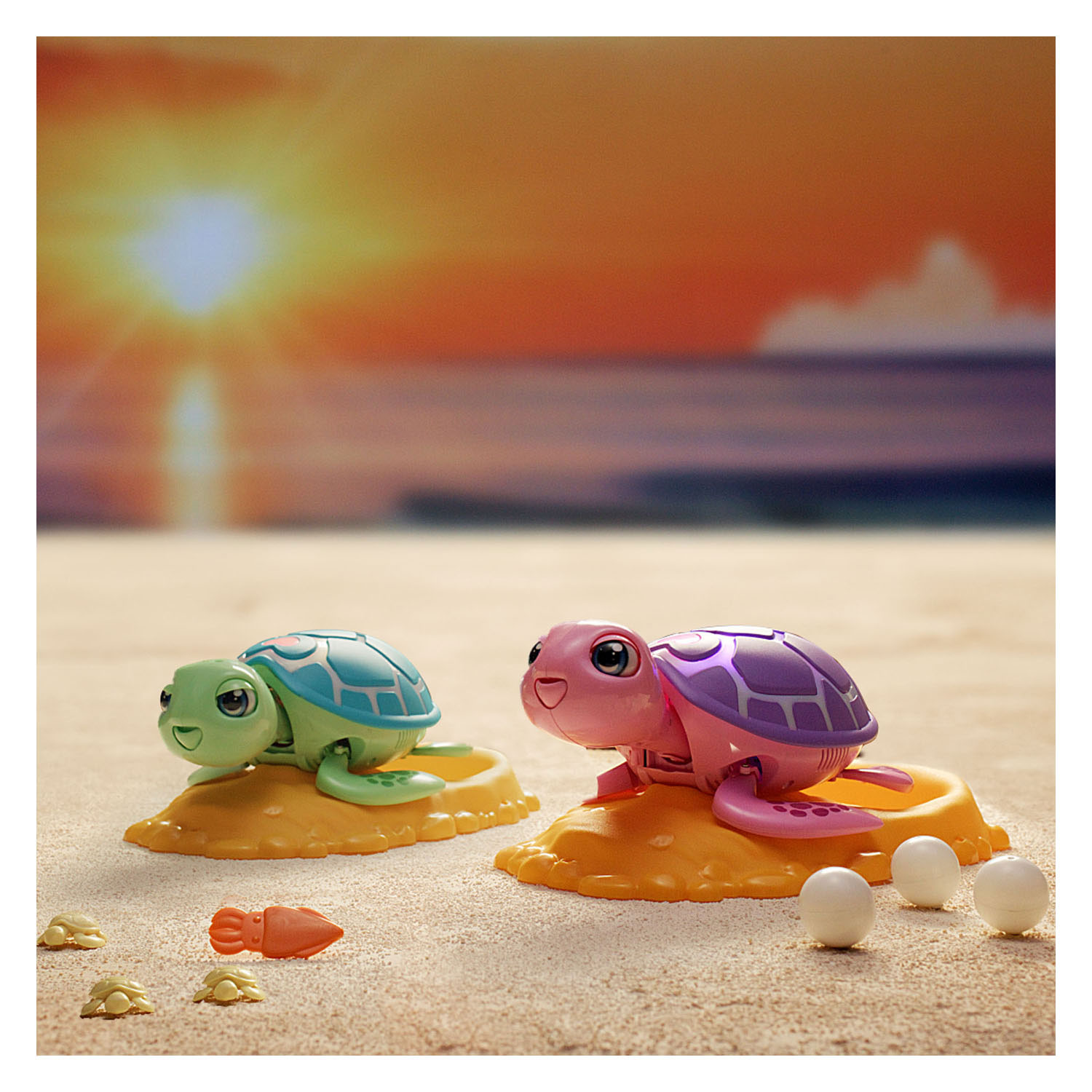 В комплекте: 1 черепаха, 3 яйца, 1 кальмар, 1 подставка-гнездо, батарейки 3 шт. типа ААА.