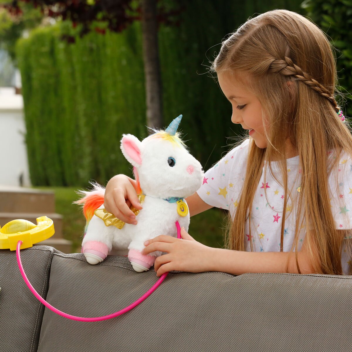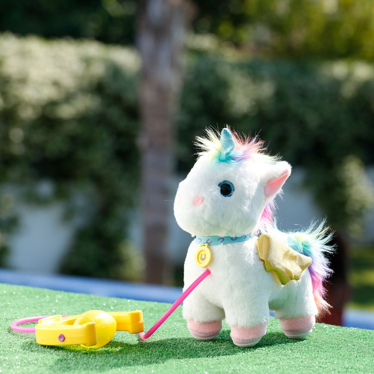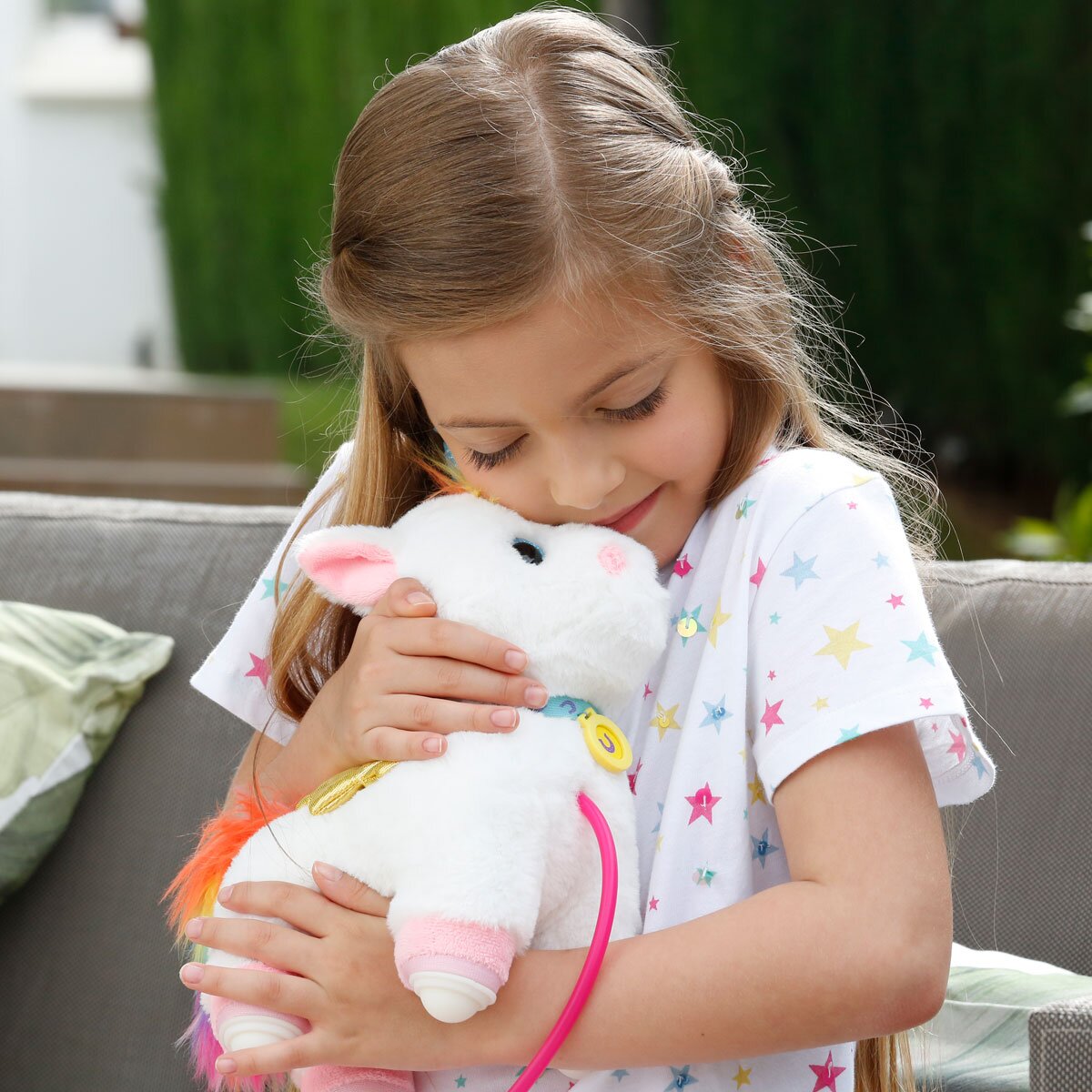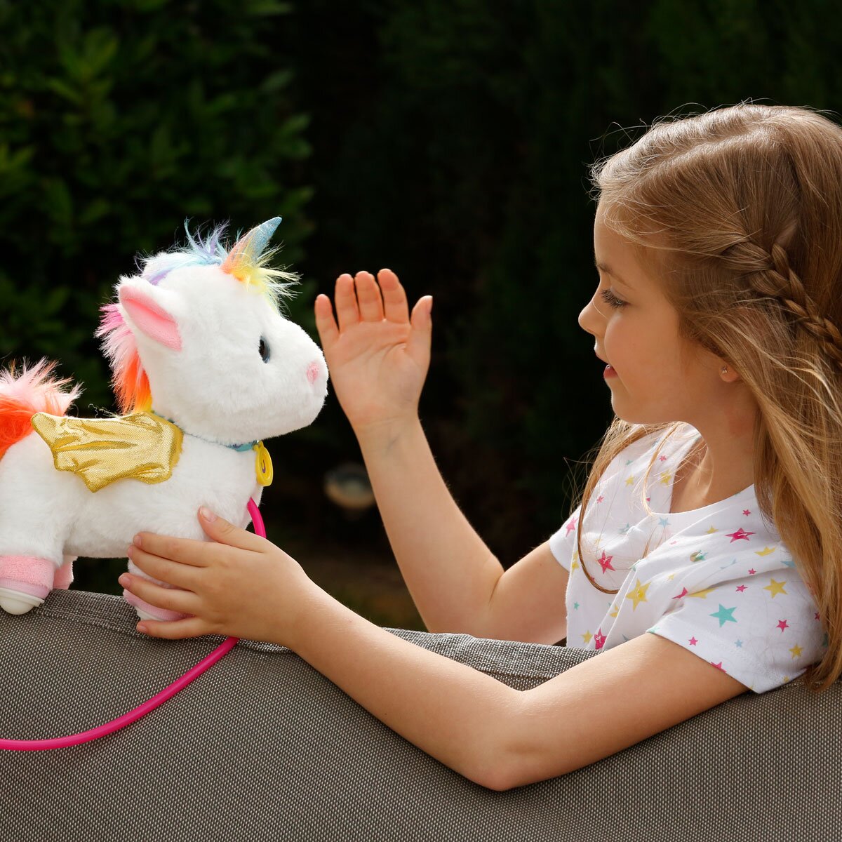 Интерактивная игрушка Sprint Единорог с поводком на прогулке – это веселый друг, который везде будет следовать за Вами! На лапках Единорога есть специальные сферы, которые прекрасно крутятся и позволяют любимцу быстро бегать и сохранять равновесие. Чтобы Единорог двигал хвостиком и крыльями – просто сжимайте ручку поводка. А чтобы услышать звуки, нужно нажать кнопку на ручке поводка. Самое главное, что внутри самого Единорога нет никакой электроники, поэтому он такой мягкий, пушистый и просто создан для объятий!