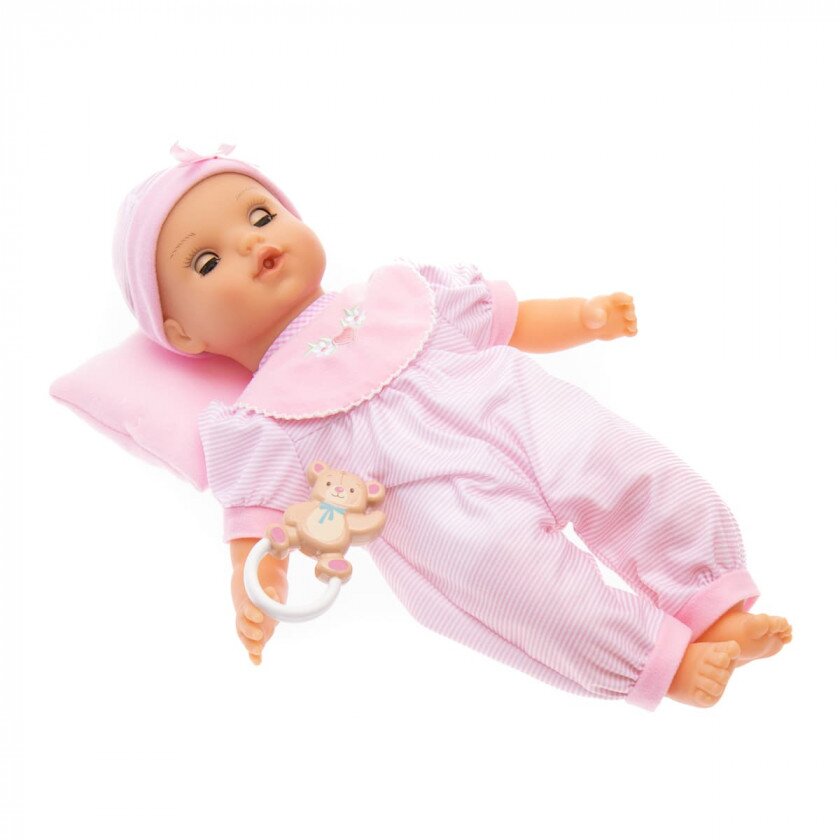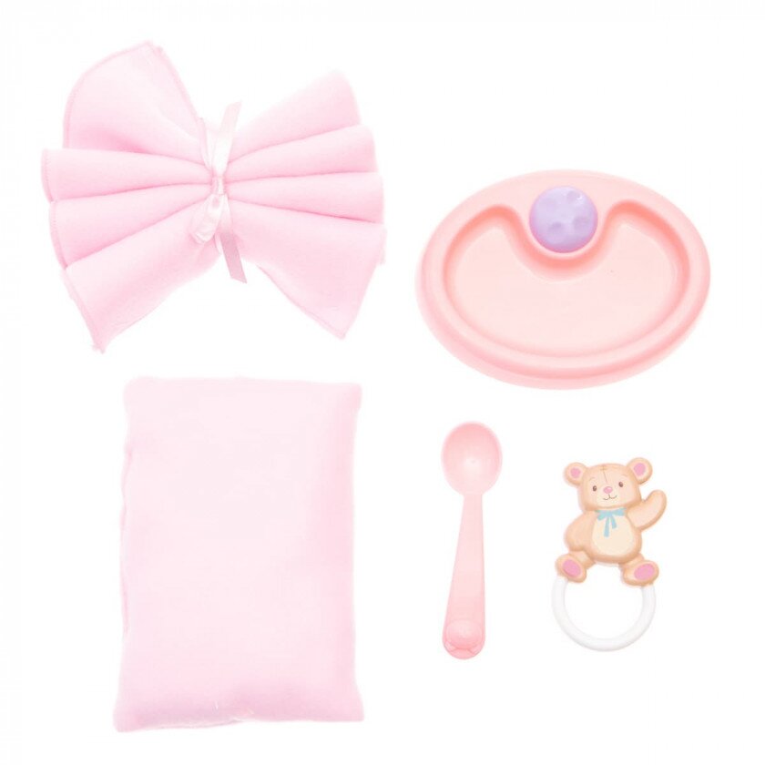 - Поставляется с аксессуарами: бутылочкой для кормления, тарелкой и ложкой, погремушкой, пеленкой, подушкой..