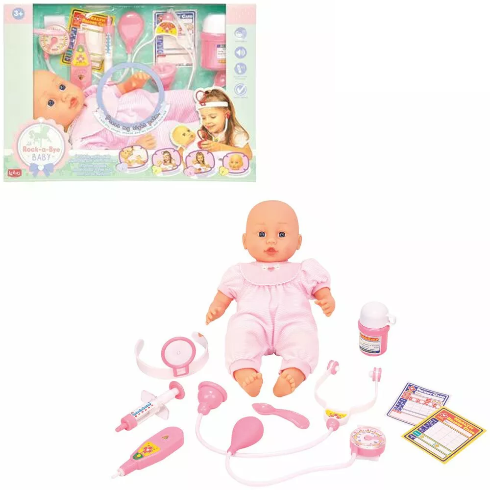 В комплекте: пупс в ползунках, стетоскоп, шприц, электронный градусник, тонометр, зеркало, бутылка с лекарством и ложечка, 2 карты.
