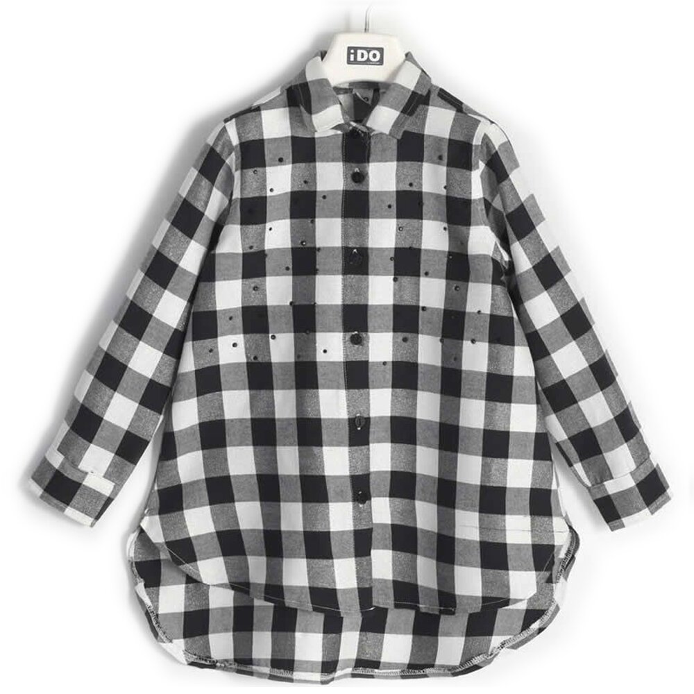 Расширенная к низу рубашка с длинными рукавами, планкой, отложным воротничком. Принт - большая черно-белая клетка. Спереди украшена аппликацией из страз. Застегивается на черные пуговицы. Модный вид блузке добавляет удлиненная спинка и закругленный низ.