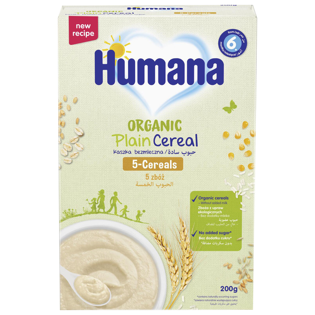 Каша безмолочная цельнозерновая 5 злаков органическая ( Humana Organic Plain Cereal 5-Cereals) - это вкусный и питательный прикорм для детей с 6 месяцев. Идеальный источник энергии и питательных веществ для малыша.