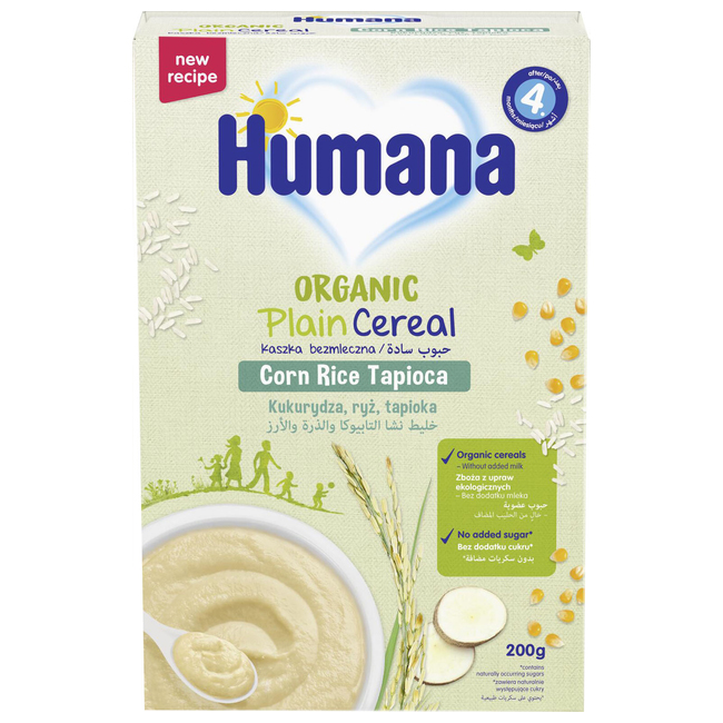 Каша органическая безмолочная кукурузно-рисовая с тапиокой Humana Organic Plain (Cereal Corn Rice Tapioca) – это вкусный и питательный прикорм для детей с 6 месяцев. Идеальный источник энергии и питательных веществ для малыша. По рекомендации педиатра может вводиться в рацион ребенка с 4-х месяцев.