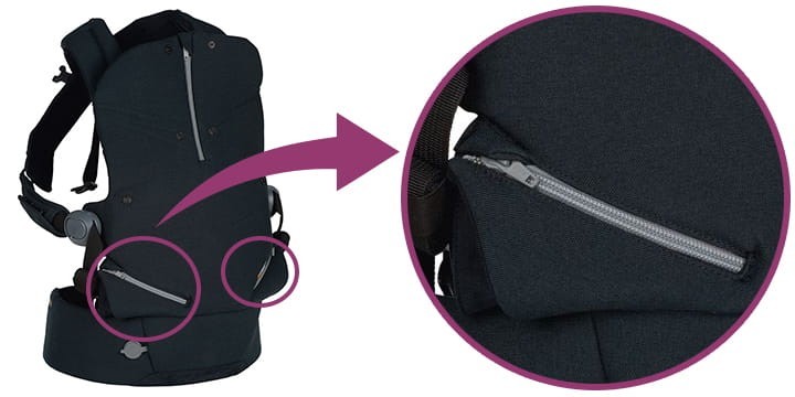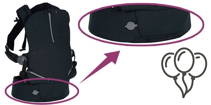 Уникальная и запатентованная воздушная подушка Airgonomics поддерживает ребенка и равномерно распределяет вес, когда ребенок сидит лицом наружу. Airgonomics — это уникальная интегрированная воздушная подушка, разработанная и запатентованная BeSafe и встроенная в поясной ремень BeSafe Haven. Оснащен специальным сводом, который можно надуть за считанные секунды, что дает ребенку удобную зону для сидения лицом наружу. Таким образом, Airgonomics не только способствует здоровому положению позвоночника и бедер, когда он обращен лицом наружу, но также помогает распределить вес ребенка на поясной ремень, чтобы родитель чувствовал себя наиболее комфортно при ношении. Регулируемые мягкие молнии обеспечивают эргономичное положение сидя, когда вы носите малыша лицом к окружающему миру. Молнии посередине вверху и по бокам должны быть закрыты. Когда малыш готов смотреть наружу (с 5 месяцев), молния расстегивается, «язычки» отгибаются и застегиваются на пуговицы. Молния также открывается по бокам.
