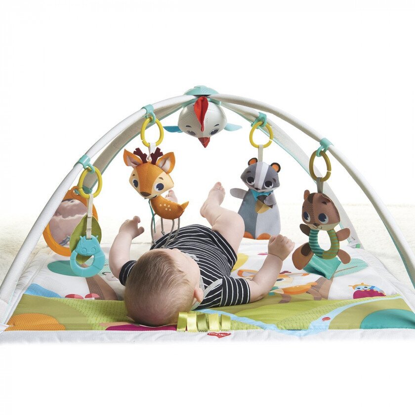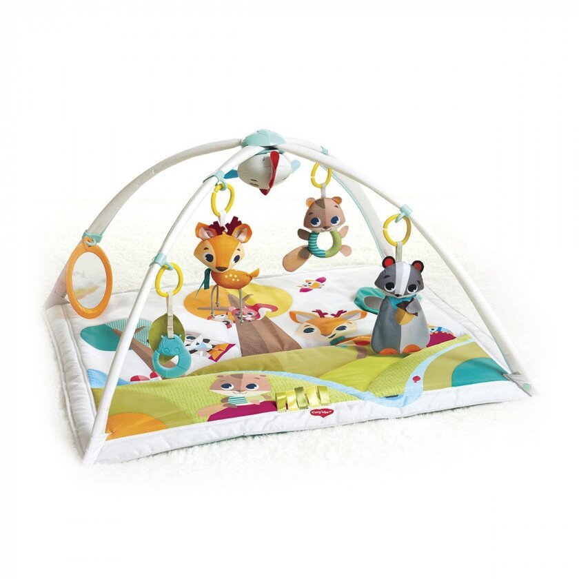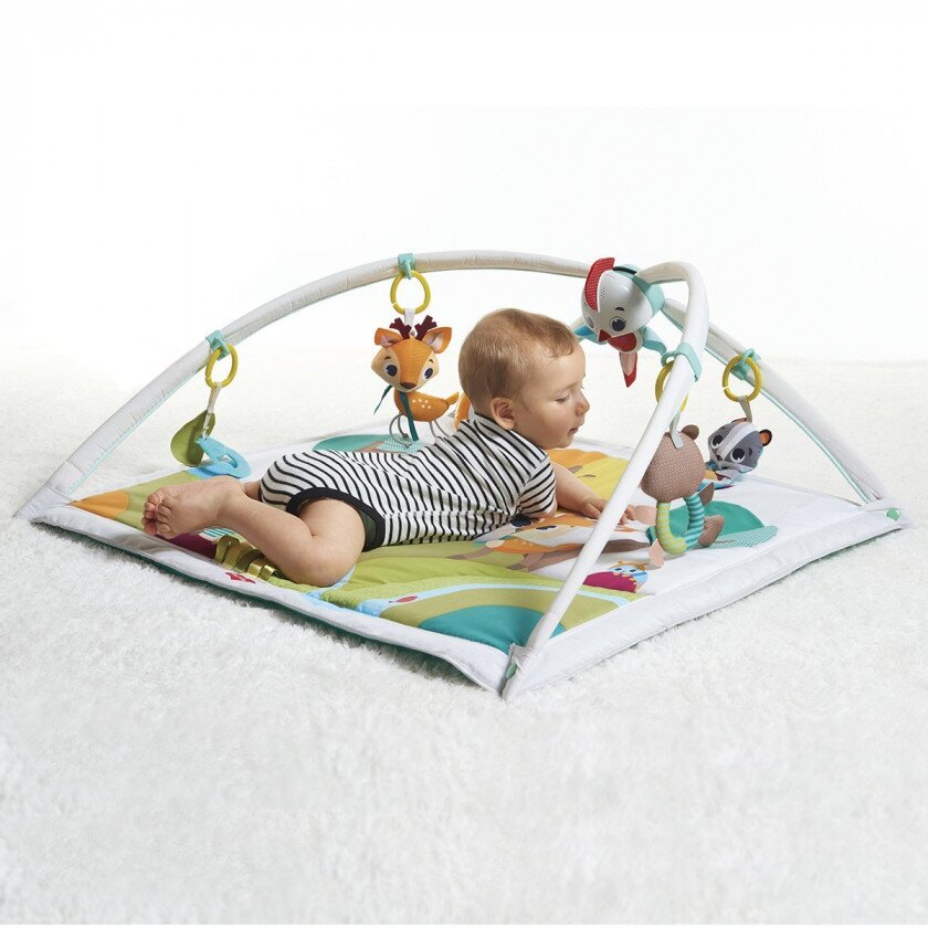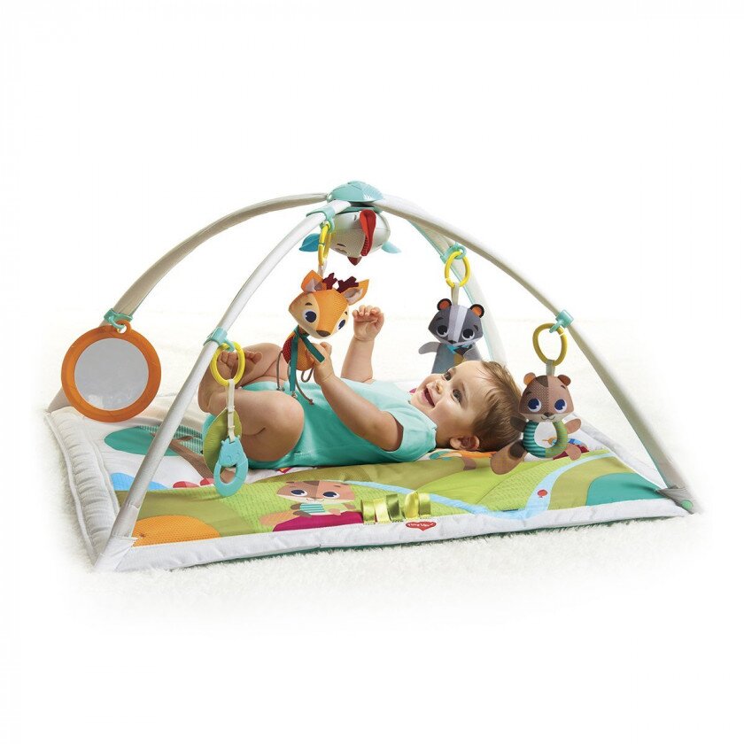 В наборе: коврик с 2 дугами, портативная игрушка-птичка со звуковыми и световыми эффектами, бобер с кольцом, шуршащий барсук-платочек, олененок, зеркальце, игрушка для прорезывания зубов. Коврик можно стирать.