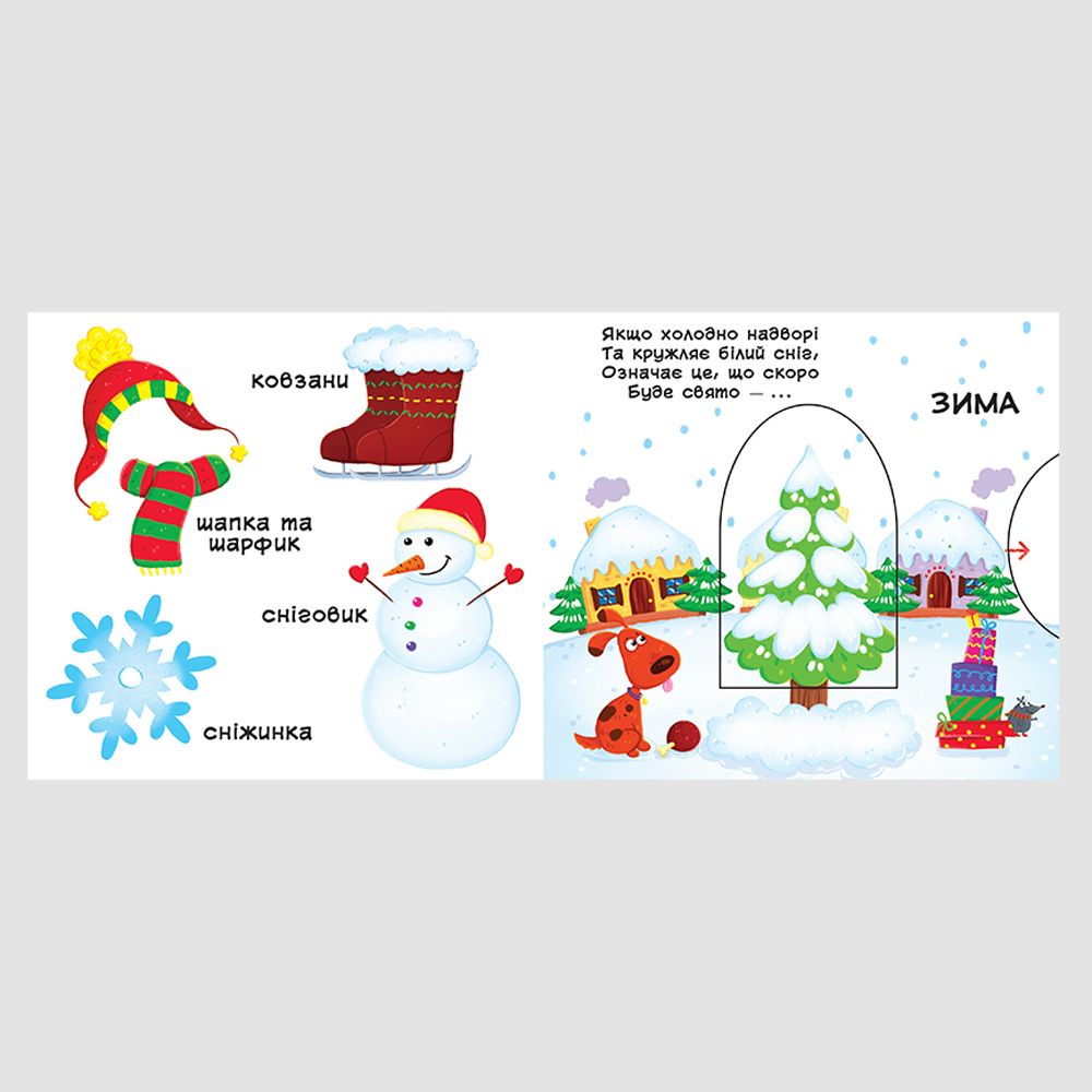 Книга с механизмом "Пори року. Дізнайся, грай, крути, штовхай" учит ребенка временам года в игровой форме. Забавные стишки, загадки и вращающийся механизм делают новый материал интересным и легким в усвоении.