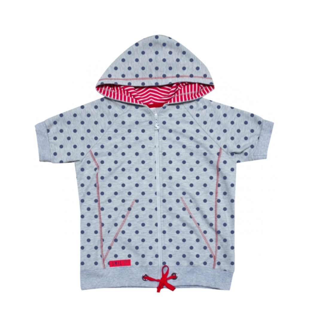 Трикотажная кофта на молнии с короткими рукавами-регланами, капюшоном, боковыми карманами. Материал – стрейчевой футер. Цвет – серый, синий, красный. Принт – горох.