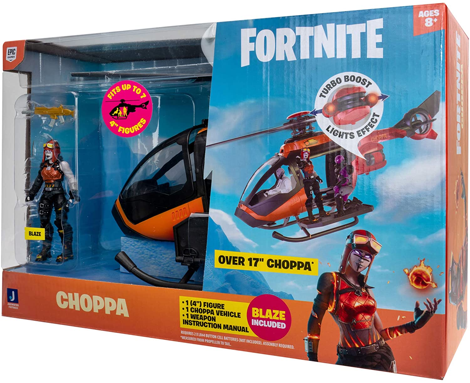 В наборе вертолет Choppa и 10 см фигурка ”Blaze" c легендарной штурмовой винтовкой. Вертолет более 40 см в длину, в нем есть места для 7 и 10 см фигурок, так что вы можете вызвать свой отряд и присоединиться к битве! Активируйте световой эффект Turbo Boost и вращайте роторы! Choppa идеально подходит для воссоздания Fortnite в реальной жизни - куда вы полетите?!