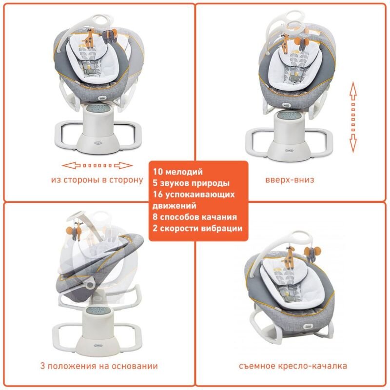 На помощь вам придет инновационный укачивающий центр Graco All Ways Soother Horizon со съемной люлькой - это универсальные детские качели, которые предлагают 16 видов успокаивающих движений и, которые обязательно придутся по душе вашему малышу и вызовут его искреннюю улыбку. Из 8 имеющихся у Graco All Ways Soother Horizon способов качания вы обязательно найдете тот, который наверняка успокоит и развлечет маленького капризулю. Graco All Ways Soother Horizon может качать вашего кроху из стороны в сторону или вперед назад, как ему больше понравиться. Вы сможете доверить All Ways Soother Horizon свое "сокровище" и не волноваться о его безопасности. Конечно он не заменит малышу нежные ручки родителей, но успокоить, развлечь и даже спеть колыбельную сможет.