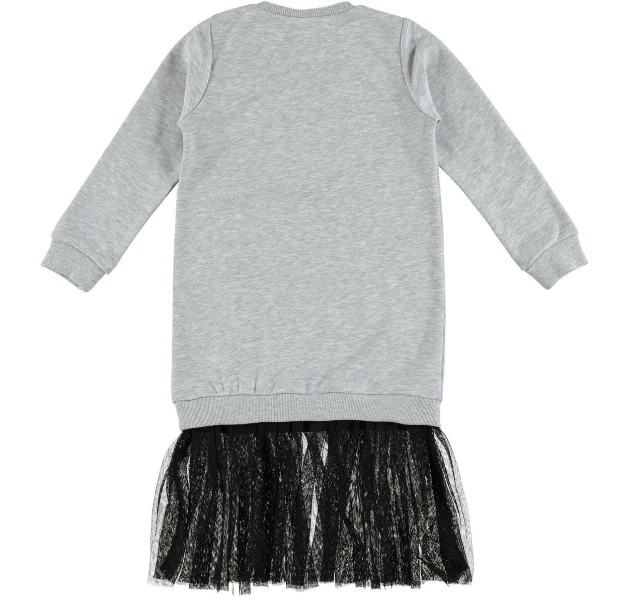 Ультрамодное комбинированное платье в стиле кэжуал от итальянского бренда. Верх сделан в виде серого трикотажного свитшота свободного кроя. Имеет круглую горловину, длинные рукава с манжетами-резинками. Украшен молодежным принтом в синих и серых цветах. Низ дополнен оборкой из черного фатина. В таком оригинальном наряде юная модница не останется незамеченной!