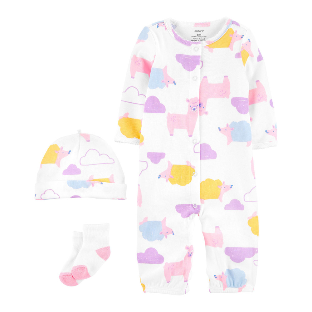 Комплект от Carter's – известного американского бренда модной детской одежды. Сшит из мягкого, гипоаллергенного хлопка. Включает шапочку, носки и слип ("человечек") для девочки ростом 69 - 72 см (от 6 до 9 месяцев).