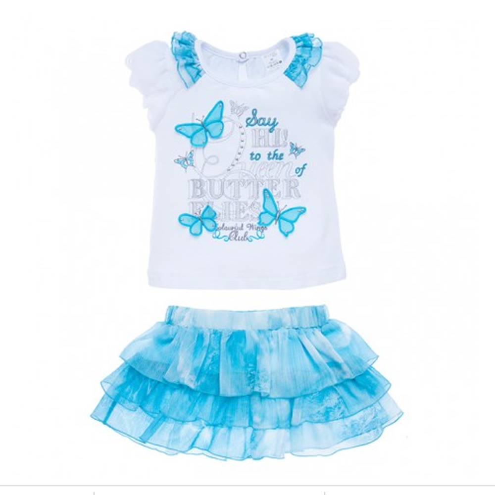 Бирюзовая фантазия (40113-16/41) – летний комплект от украинского бренда Garden Baby для девочки 4-5 лет. Состоит из футболки и юбки. Верх сшит из белого стрейч-кулира. Футболка имеет круглую горловину, застежку на спине, короткие рукава. Украшена принтом "голубые бабочки". Юбка из голубого шифона имеет пояс-резинку, оборки в три слоя.