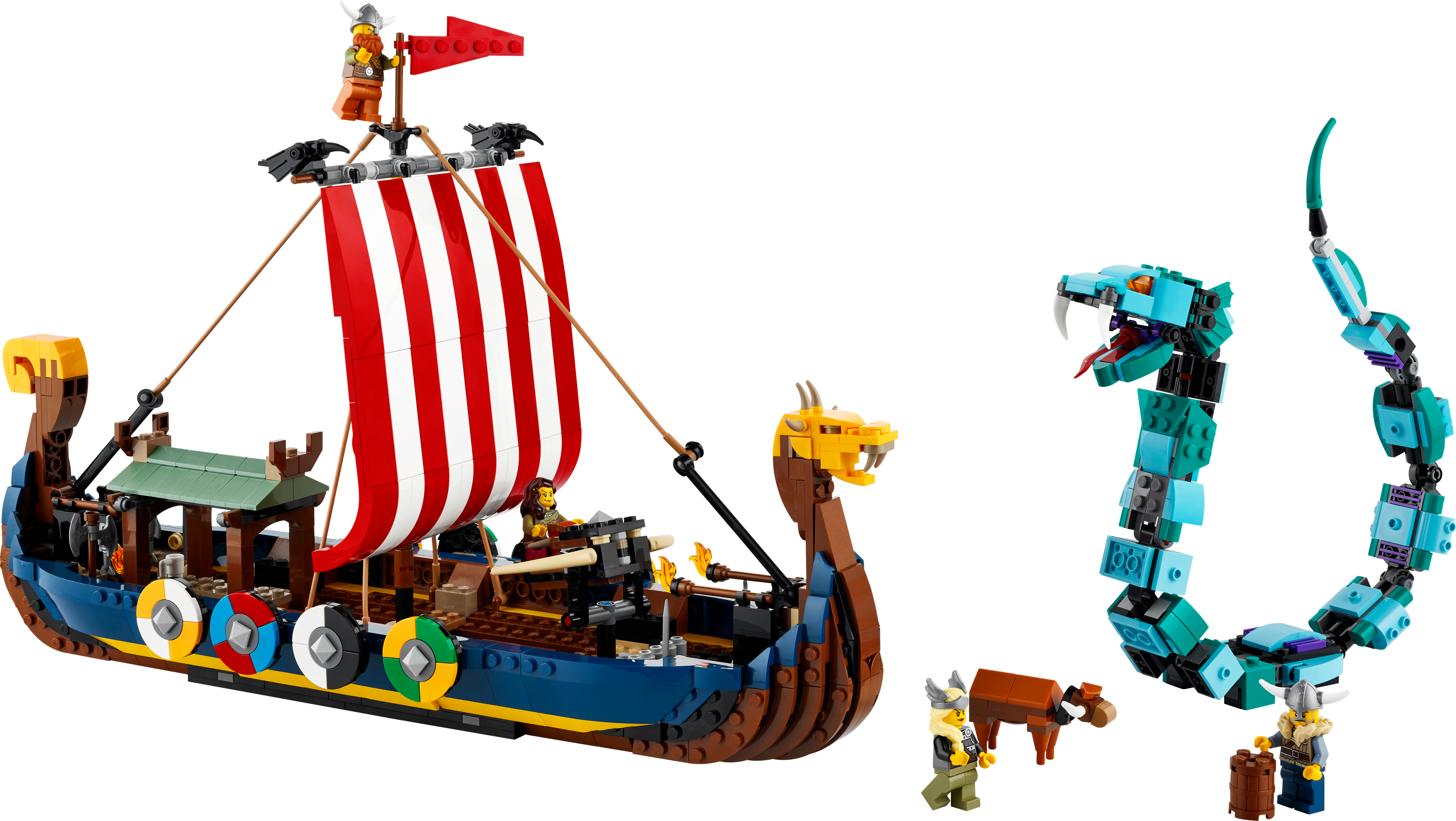 Особенности набора LEGO 31132 Creator Корабль викингов и Мидгардский змей: 3 игрушечных викинга в 1 наборе — детям понравится этот набор LEGO с кораблем викинга, домом викинга и игрушечным волком Фенрисом; неограниченные варианты игры — дети могут выбрать свое приключение с викингами: корабль викингов, борющийся со страшным змеем, дом викингов с драконом или схватившийся с четырьмя викингами скандинавский волк; подвижные модели — у игрушечного змея Мидгардского подвижная голова, хвост, тело, пасть и плавники, а у игрушки волка подвижная шея, челюсти и лапы, так что дети могут разыгрывать динамичные истории; много функций — корабль викингов украшен восемью щитами, и на нем стоит стреляющая шипами баллиста, есть корова и две вороны из кубиков, а крышу дома викингов можно снять.