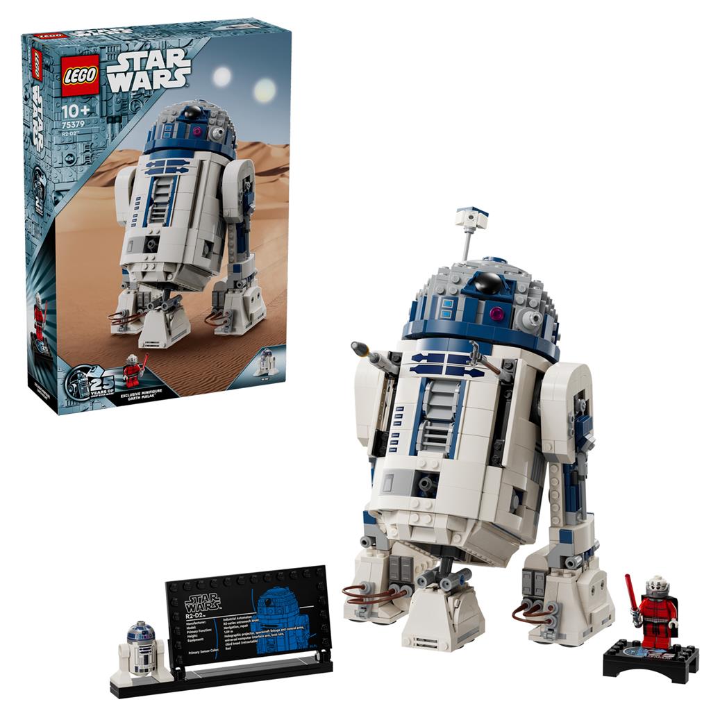 Набор ЛЕГО 75379 - не первое появление R2-D2 в формате сборной модели. В этом случае он не слишком большой и достигает 24 сантиметров в высоту, 16 в ширину и 11 в длину. В дизайне сборки сохранены все примечательные особенности дроида. Он стоит на двух ногах, имеет белый корпус и серую куполообразную голову c сенсором-глазом. По всему корпусу воссозданы его датчики и оборудование, как с использованием деталей, так и в виде наклеек. К функциональным возможностям относится то, что голова дроида может вращаться на все 360 градусов, давая роботу полный обзор. Также он может менять угол наклона, раскачиваясь на ногах. Часть деталей прикрепляется к астромеханику уже после окончания сборки и так же просто может быть снята: