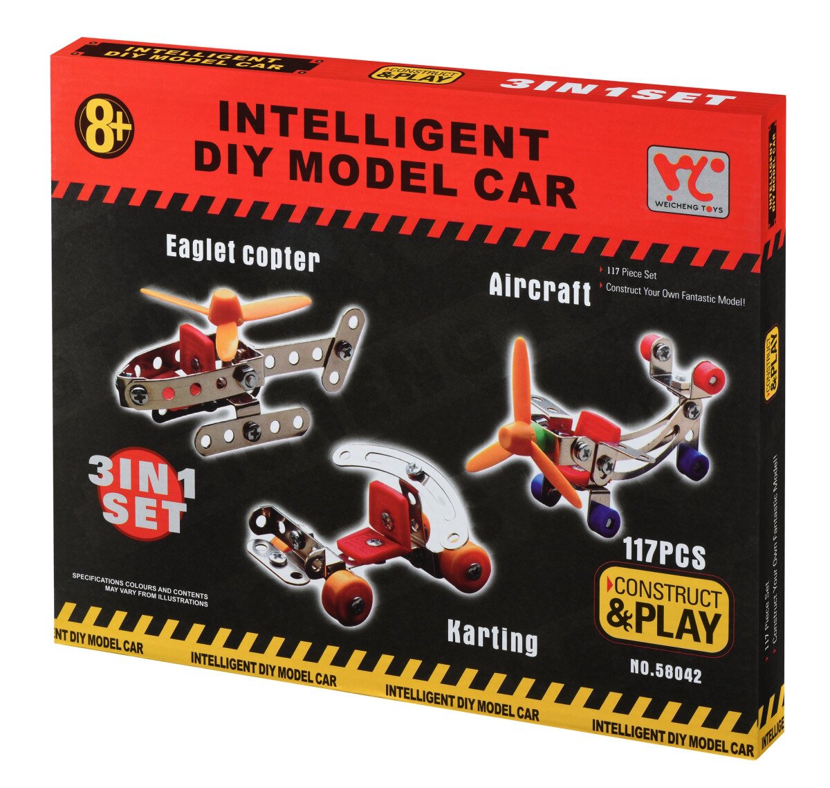 Набор состоит из металлических и пластиковых деталей, сочетаются с помощью винтов и гаек. В комплект входит инструкция по схеме, а среди 117 деталей является отвертка и гаечный ключ для удобства и надежности крепления.