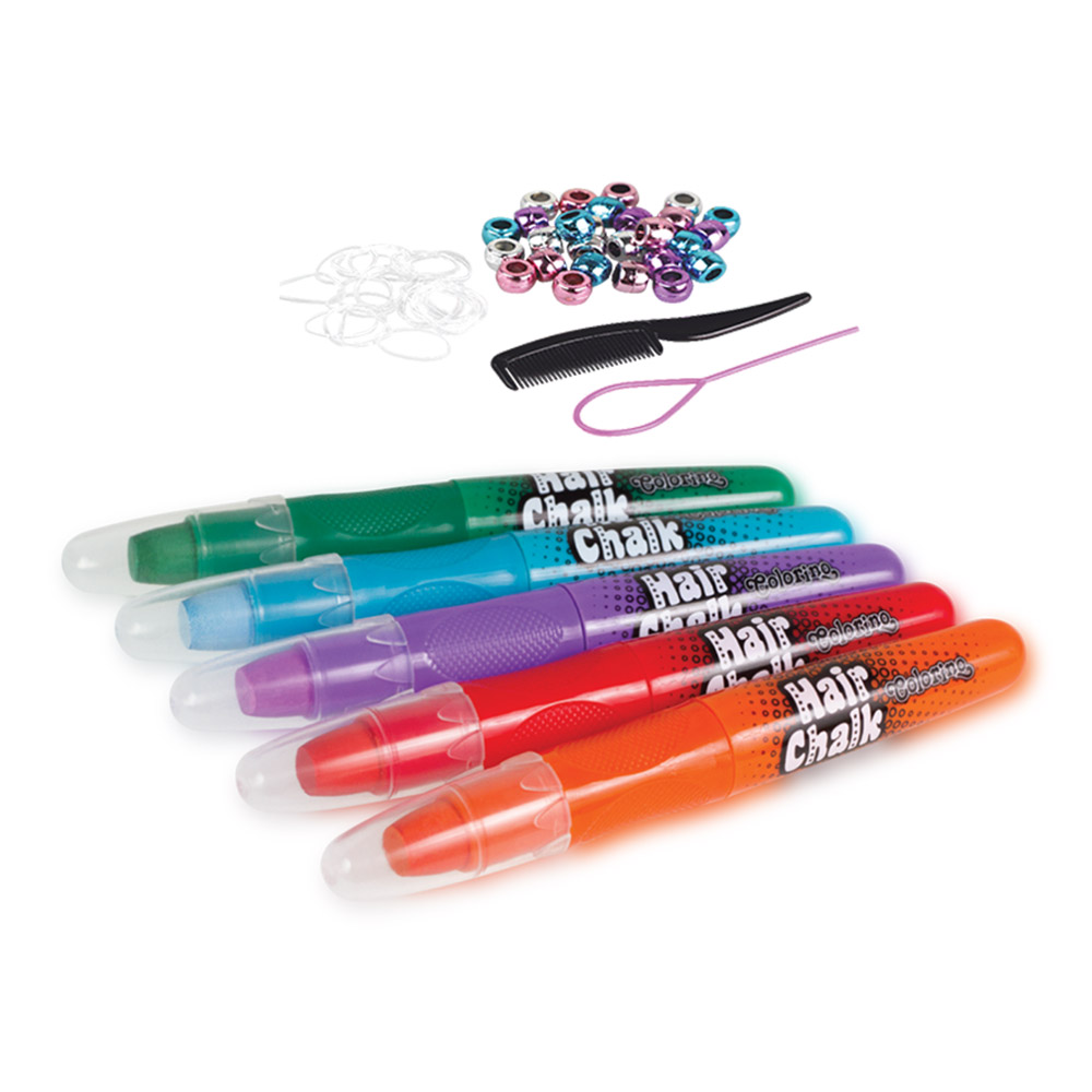 В набор входит: 5 разноцветных мелков в виде удобных карандашей; резинки для волос; бусины; крючек; расчёска.