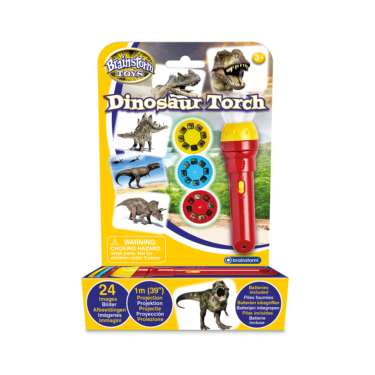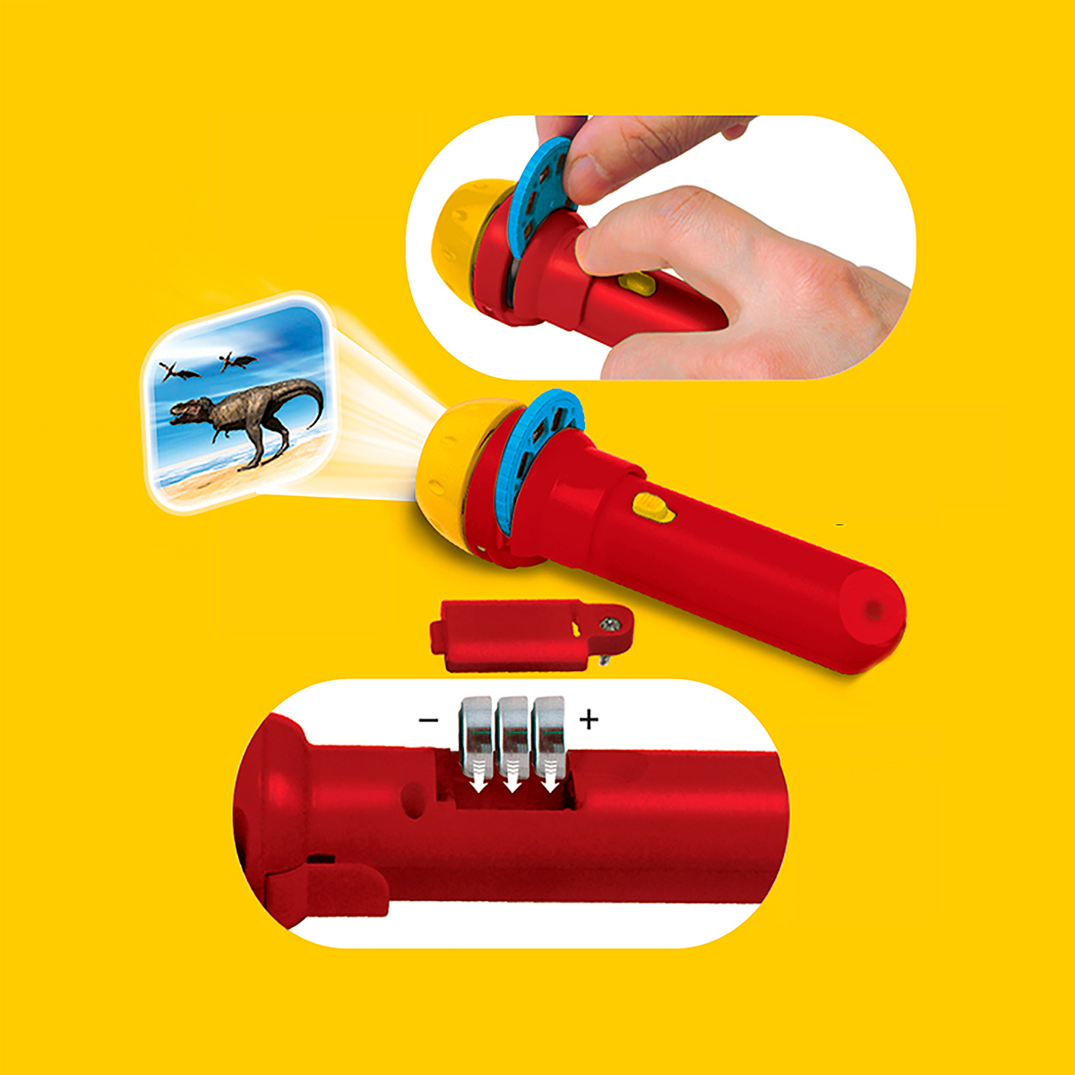 - В комплекте с фонариком есть 3 диска с цветными изображениями 24 разных динозавров.