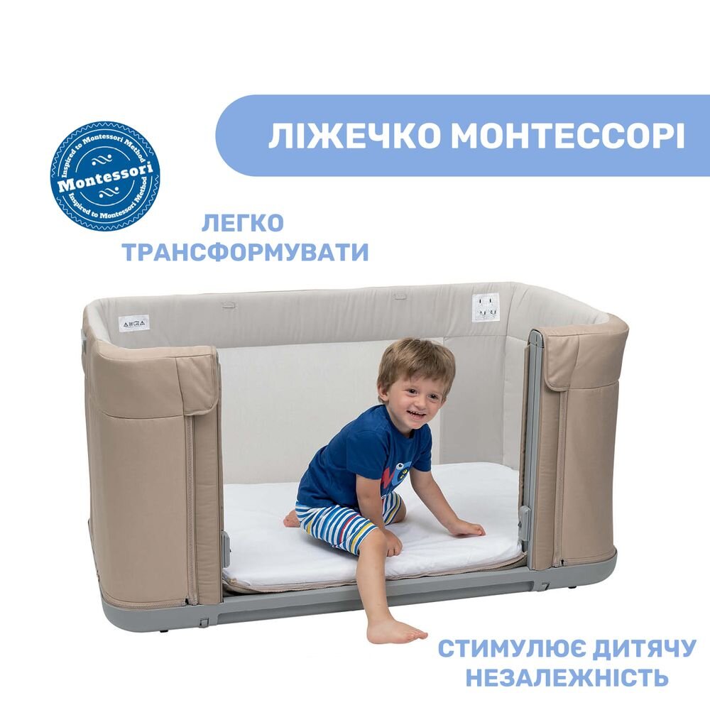 Классическая кроватка трансформируется в напольную кровать по принципу Монтессори, для обеспечения свободного передвижения ребенка.