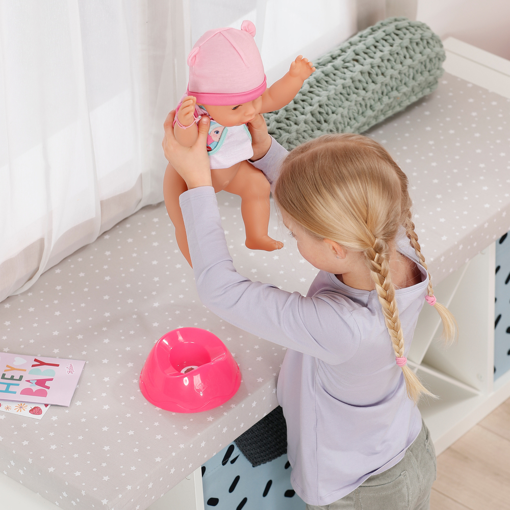 нажмите на мягкий животик куклы, чтобы она сходила на горшок
