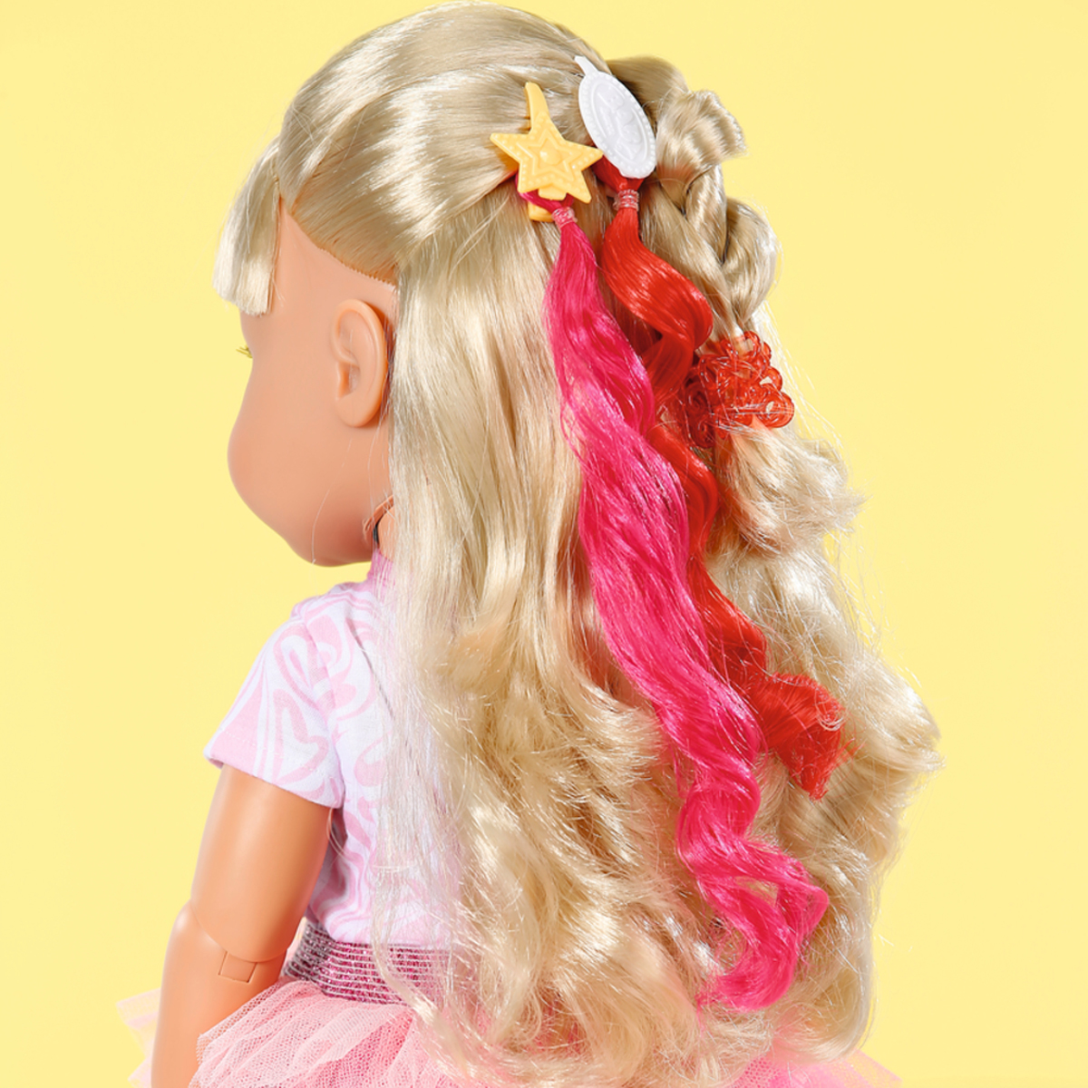 Стильная сестренка очень любит танцевать. Она одета в разноцветную юбку, футболку с сердечком и леггинсы. А еще у нее подвижные ручки и ножки. Так что переодевать ее довольно легко. Девочка любит купаться в ванной и обожает, когда укладывают ее длинные светлые волосы.