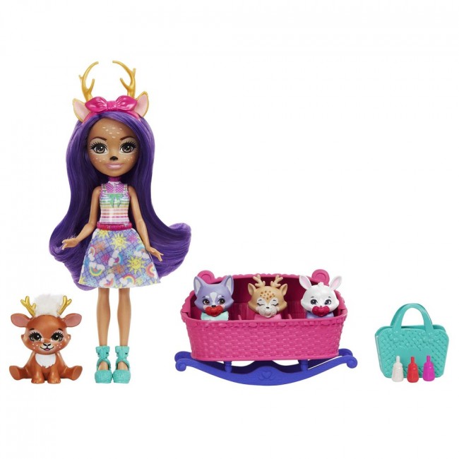Сначала дети увидят, что они получили милую куклу Оленицу Денису Enchantimals 15 см высотой с крутой прической и нарядами, а также ее лучшего друга-зверушку Спринта большого размера, который разместился рядом с разноцветным листиком и цветущим деревом.