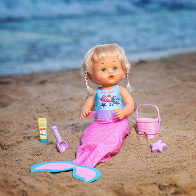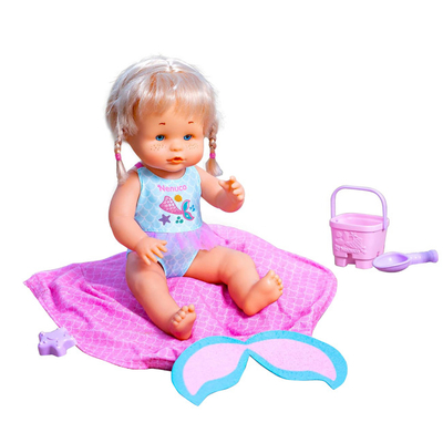 Кукла Nenuco Русалочка на пляже с белокурыми волосами и милой веснушкой на лице. Ненуко собралась на пляж, взяв с собой пляжное полотенце в виде хвостика русалки и аксессуары для игр в песке (лопатка, ведерко и морская звездочка).