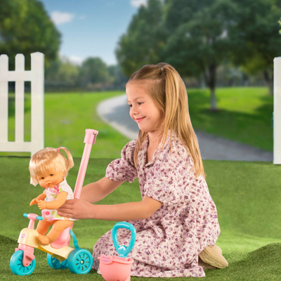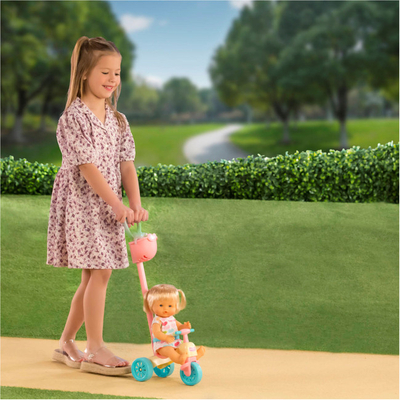 Она имеет яркий и удобный трехколесный велосипед-каталка, который имеет ремень безопасности и регулируемую ручку с корзиной для хранения всего, что может понадобиться на прогулке, например, подгузника и детской бутылочки, входящих в набор.