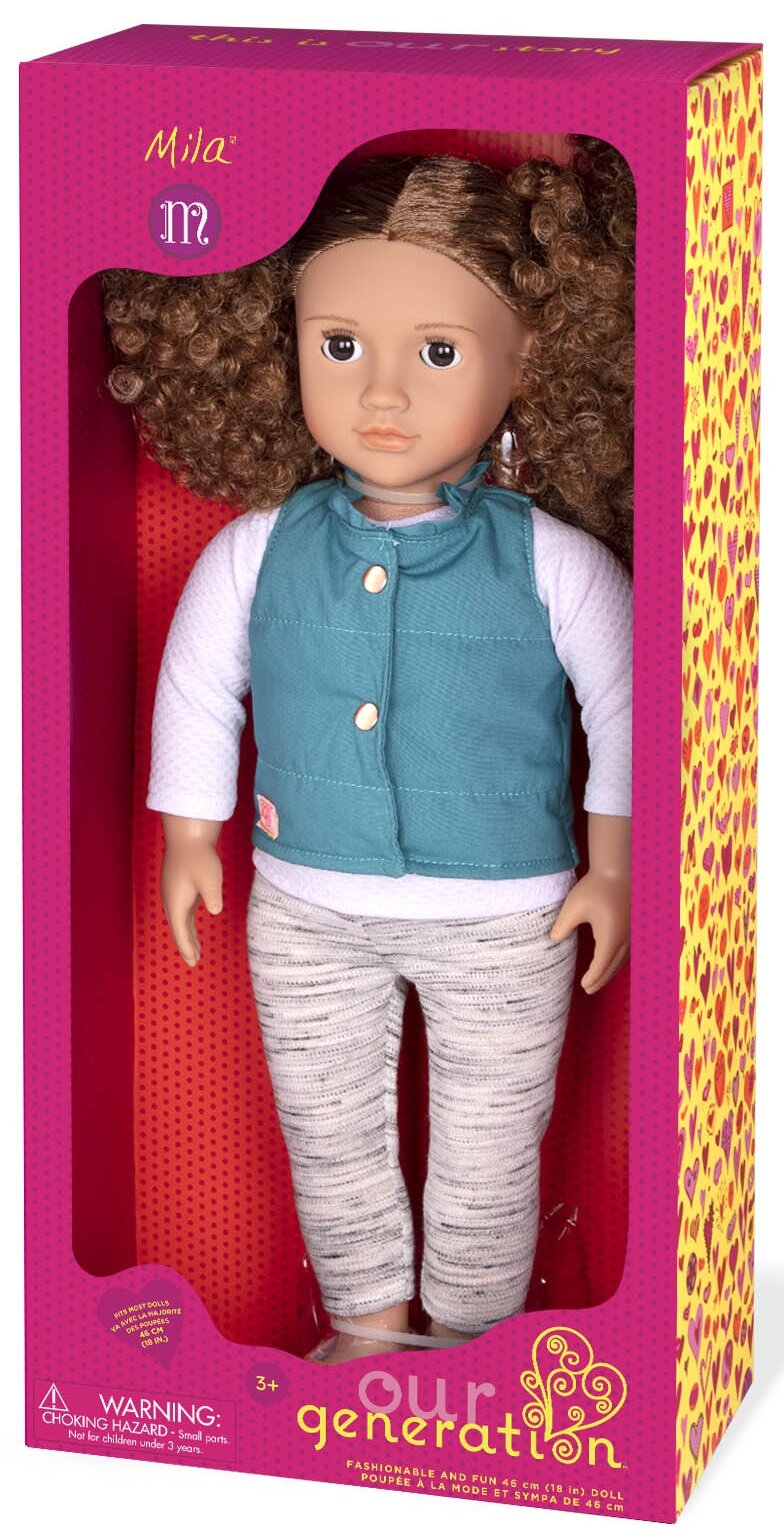 Мила - представляет коллекцию невероятных кукол Our Generation. Она выглядит как настоящая девочка. У нее длинные вьющиеся каштановые волосы. Поэтому девочки с удовольствием могут расчесывать их и укладывать в прически.